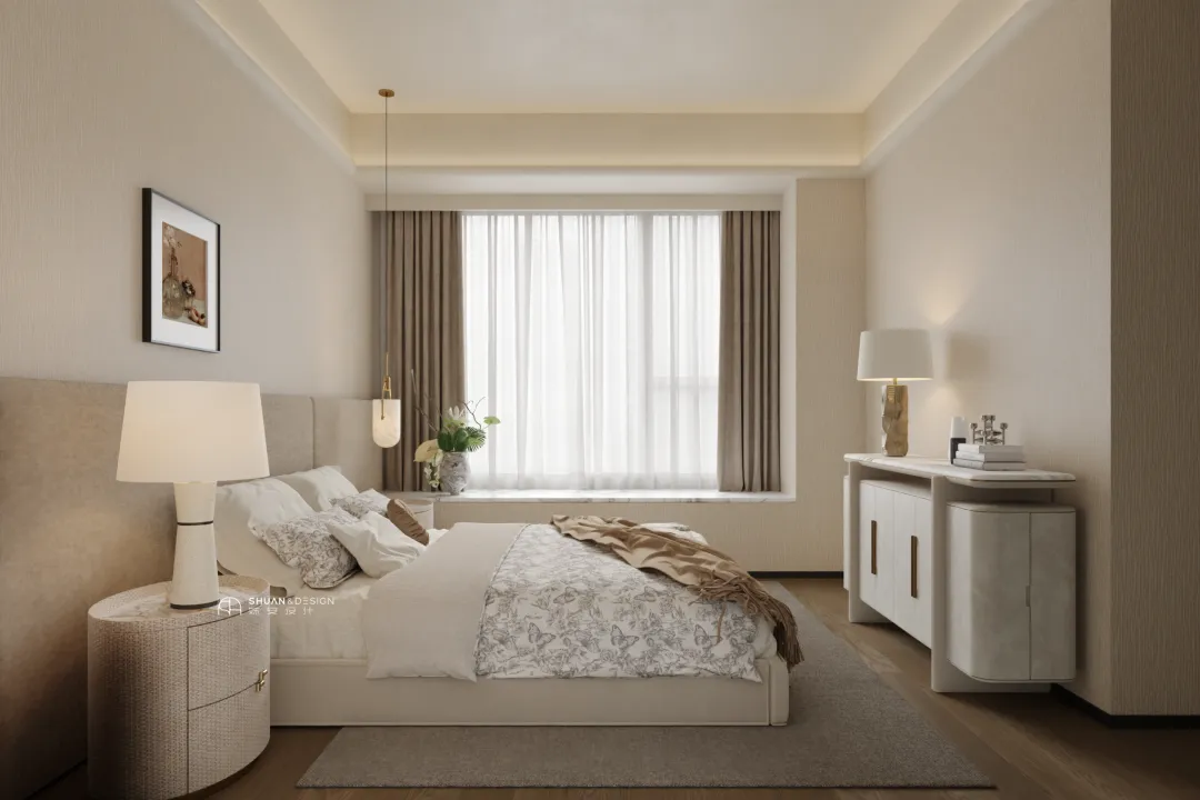 主卧作为私享空间,既要沉稳大气,也要舒适静谧,这套设计完美平衡了两者。