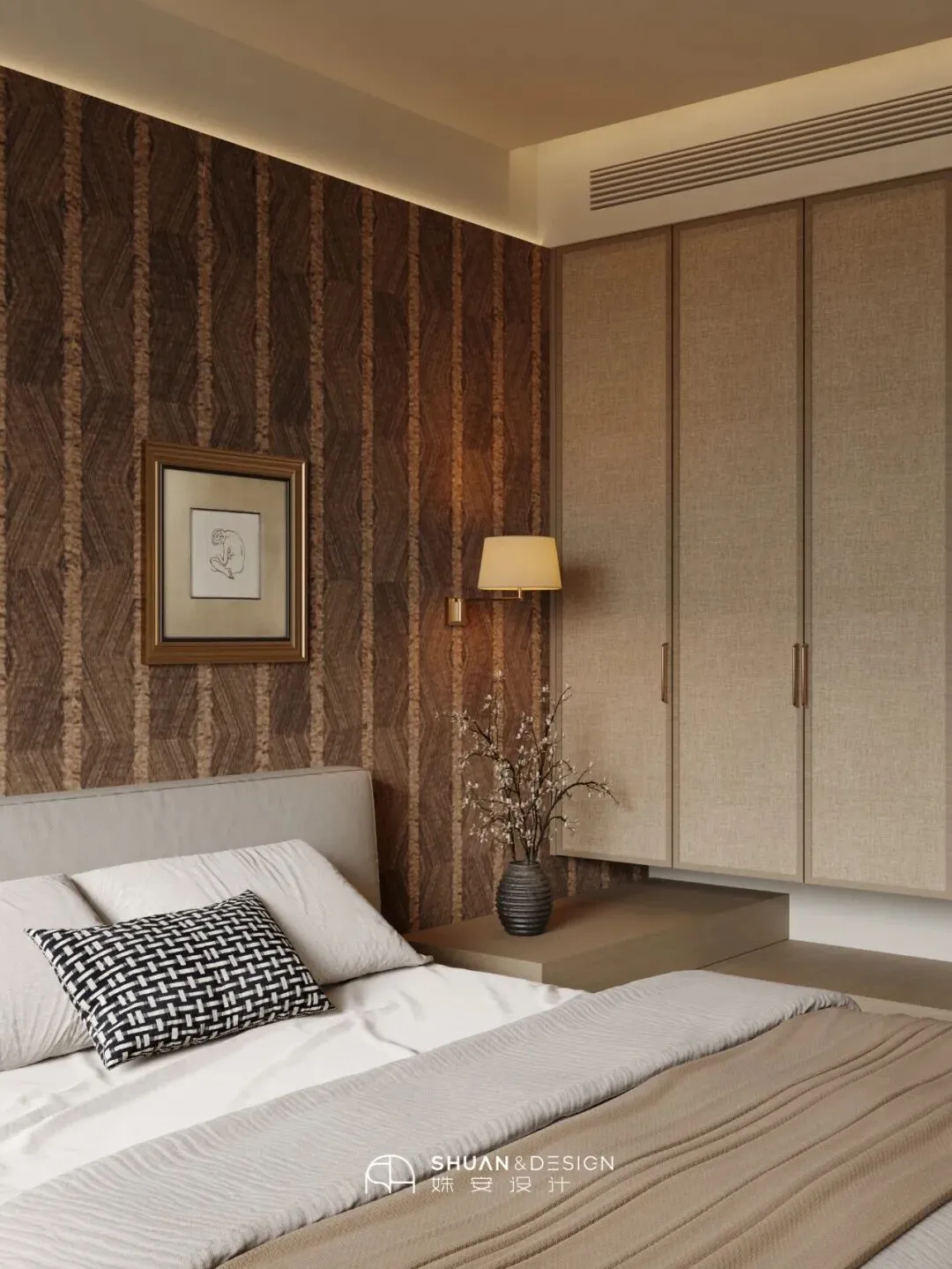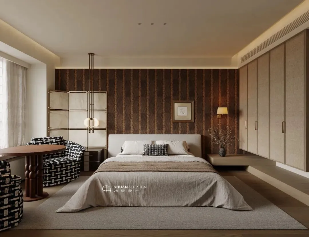主卧背景墙选用深棕色竖条纹复古壁纸,瞬间提升空间的奢华感与沉稳气质,与公区的温润米色形成冷暖对比,辨识度拉满;壁纸的肌理感,也让空间多了一份中古的复古韵味,不张扬却很有格调。