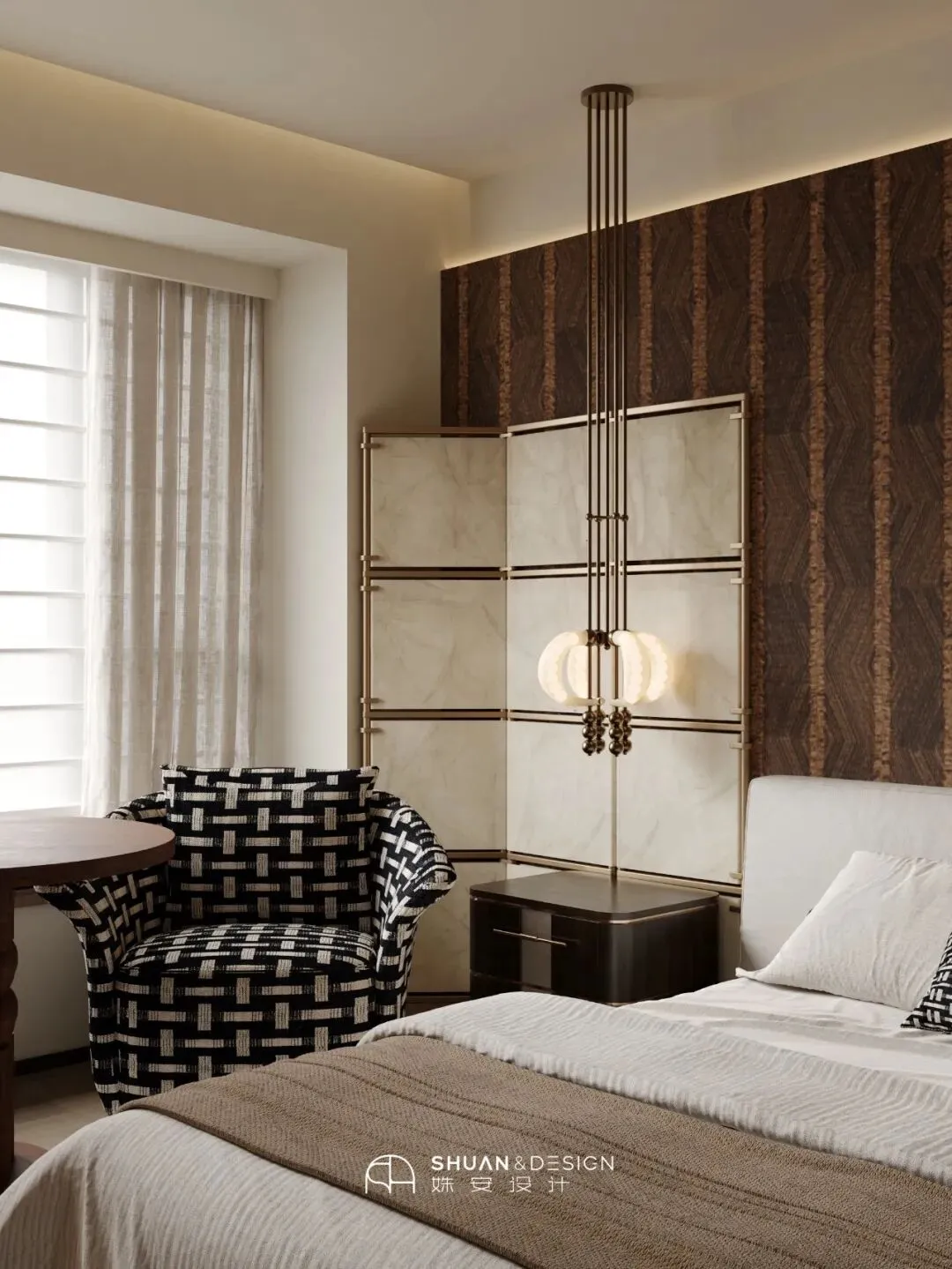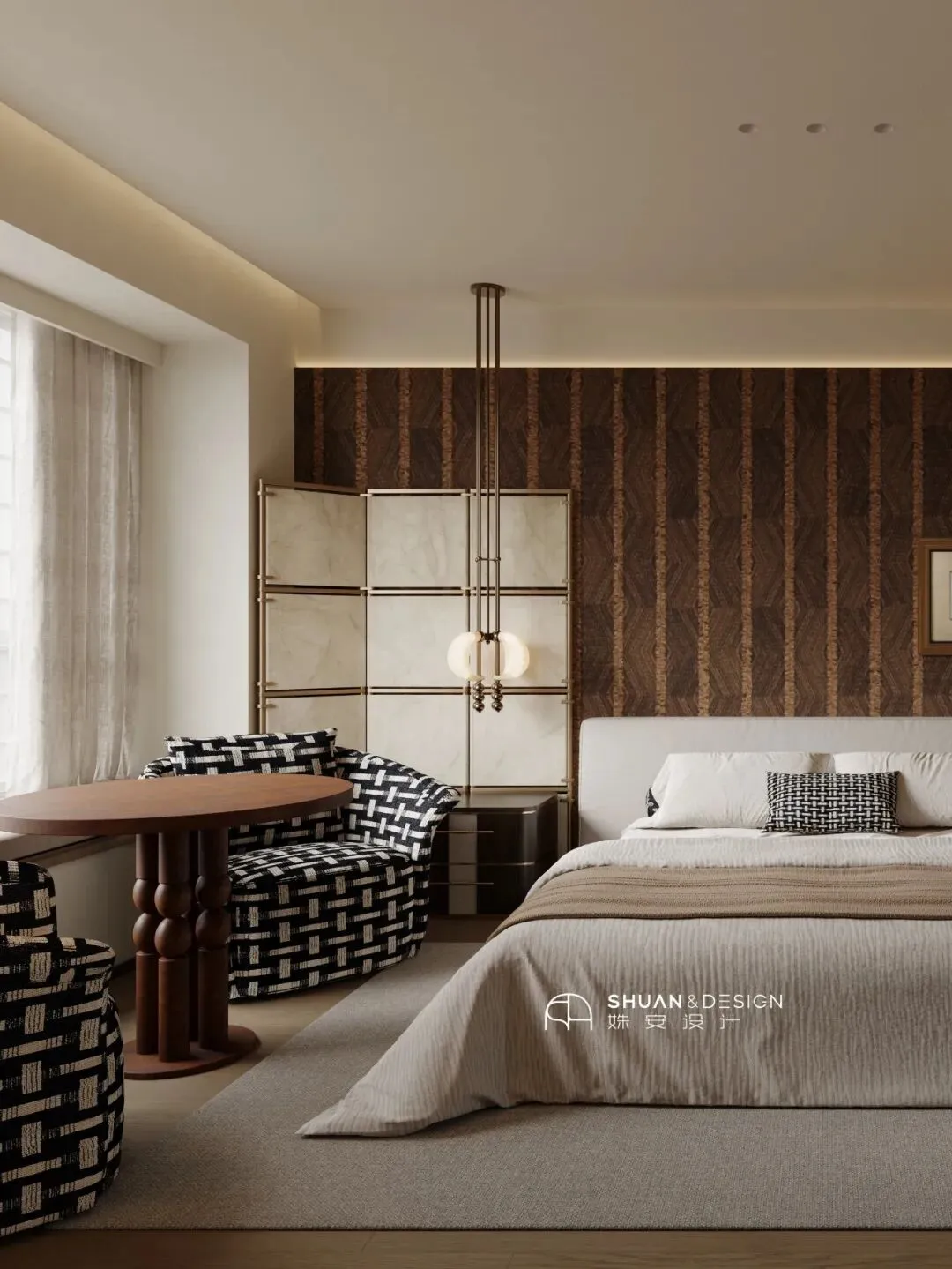 床品选用米白与焦糖色的暖色调组合,质感柔软亲肤,贴合睡眠需求;搭配黑白棋盘格单椅、金属质感的艺术吊灯与屏风,既有意式复古的浪漫,又有主卧所需的静谧舒适,在这里,既能卸下一天的疲惫,也能享受独属于自己的松弛时光。