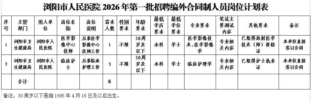 因工作需要,根据《浏阳市机关事业单位编外合同制人员管理办法》(浏编委发〔2021〕67号)文件精神,浏阳市人民医院决定面向社会公开招聘编外合同制工作人员6名,现就有关事项公告如下:浏阳市人民医院是一所集临床、教学、科研等于一体的三级甲等综合医院,是湖南师范大学附属湘赣边区医学中心、浏阳市肿瘤医院、浏阳市红十字医院,中南大学、南华大学、长沙医学院临床教学医院。医院占地170亩,建筑面积15.6万平方米,编制床位1480张,工作人员1900余人,拥有中高级职称的专家1100余人,先后有30多名学科带头人赴美国、德国、英国、日本、以色列、新加坡、台湾等国家和地区进修学习。1.具有中华人民共和国国籍,遵守中华人民共和国宪法和法律。2.拥护中国共产党的领导,遵纪守法,品行端正,具有良好的品行和职业道德。5.工作责任感强,能吃苦耐劳,有良好的团队合作精神。6.综合素质优,有较强的事业心、责任感、服务意识。7.年龄30周岁及以下是指1995年4月16日及以后出生。8.有执业证或资格证要求的岗位,通过相关考试尚未取得证书的可暂凭成绩合格单报名。9.未取得岗位所需相应学历毕业证的不得报考(应届毕业生除外)。招聘工作由浏阳市人民医院组织实施。招聘程序:发布公告—报名及资格审查—笔试—面试—体检—考察并确定拟聘用人选—公示—办理相关人事聘用手续。(一)发布公告