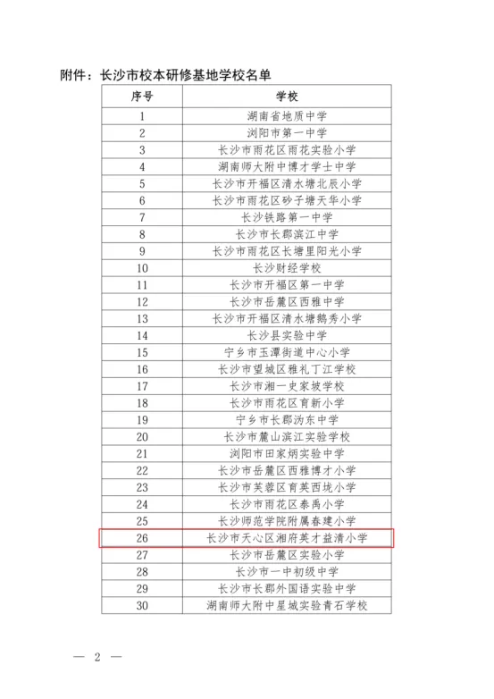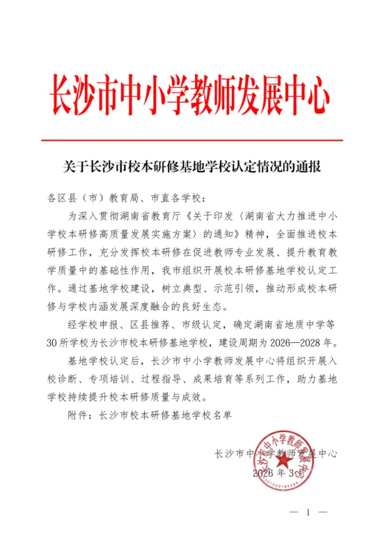 近日,长沙市中小学教师发展中心公布了《关于长沙市校本研修基地学校认定情况的通报》。经学校申报、区县推荐、市级认定,我校成功入选2026-2028年长沙市校本研修基地学校,特向全校师生及关心我校发展的社会各界人士报喜!