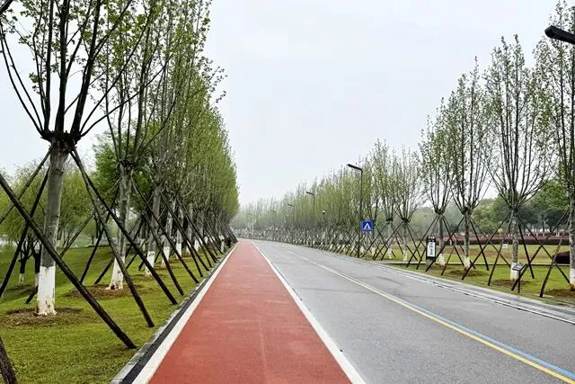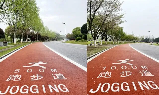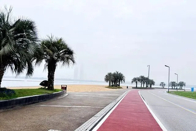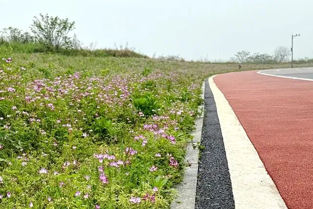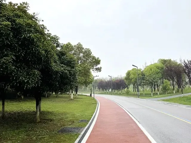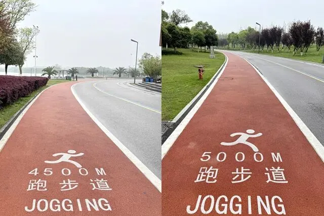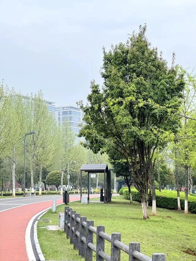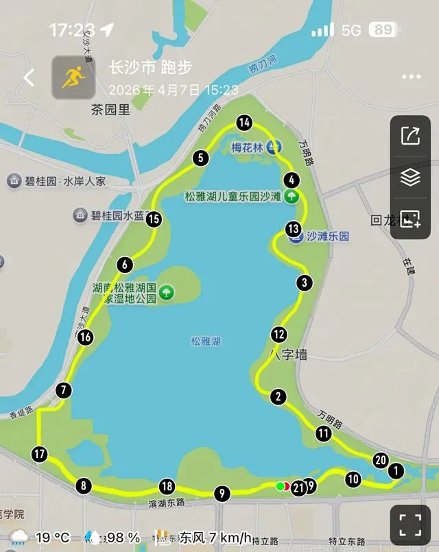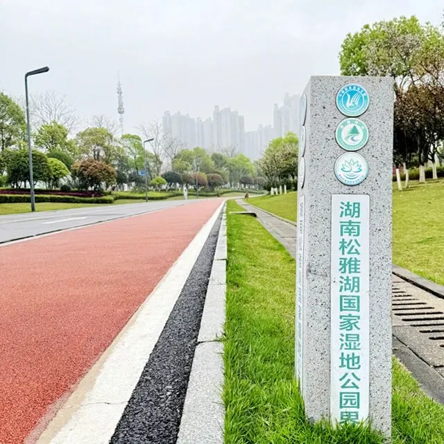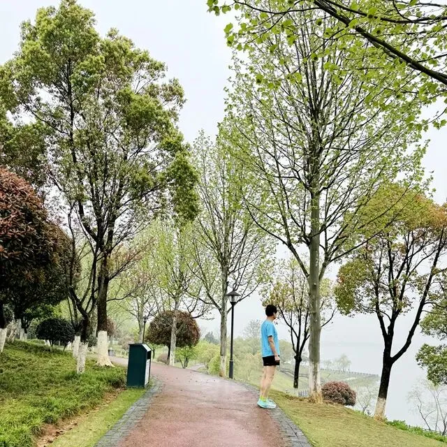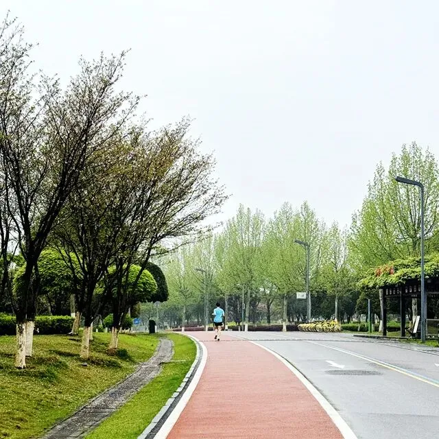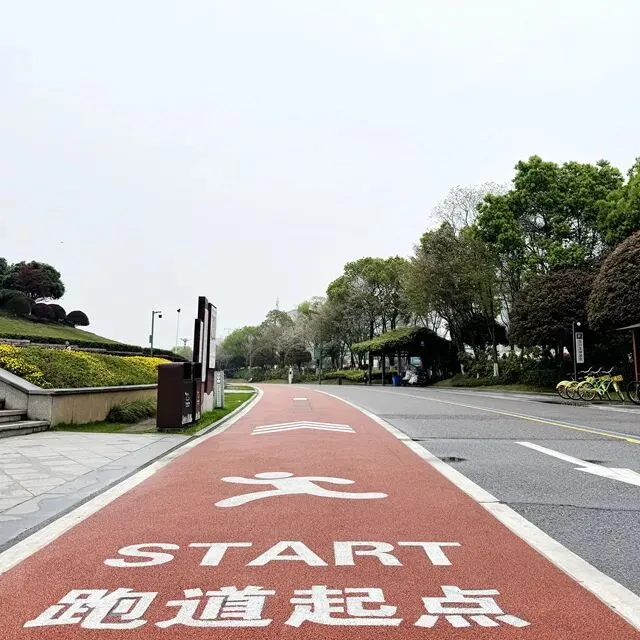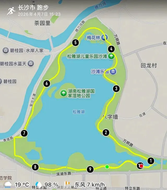 每个跑步的人,心里都有一张地图,没打过卡的地方,永远在惦记。位于长沙县东北部的松雅湖湿地公园,前身是湘江支流捞刀河的旧河床,退田还湖后成了湖南省内最大的城市湿地公园。导航发现有十几个停车场,我到的是南门的一个停车场,车位挺多,停车很方便——可能因为不是节假日吧。停好车下来,满眼新绿,空气清新,湿地公园名副其实。雨后的塑胶跑道干净整洁,很养眼。最关键的是没一点积水,点赞高科技。第一次来,看什么都是新鲜的,先拍个照。老徐已经热完身开始跑了。不管他,我先慢慢玩一会儿,周边转一转,再开始不迟。周边晃荡了一会儿,发现停车场往前大约200米处有个公共卫生间。跑步人特地进去观察了一下,还蛮干净,唯一不完美的是里面没纸,但卫生保持得不错。可能因为雨后的原因,人很少,这跑道可以闭眼跑,不枉我特地来一趟。接下来开始正经跑步了。第一次跑,对跑道没一点概念,跑了一会儿才发现绿道上有跑步里程指示,显示是1500M——哦豁,原来还有起跑点。不过没关系,反正会跑个圈回来的。最值得说的是,这个塑胶跑道脚感真好啊,这是我跑过最舒适的跑道了。湿地观鸟亭和爱心树,两处地标。这个心形标志,官方说是“遇见爱情”的爱心树,不说我都没看出来。这里应该是地标“芦笙游石”——只是芦苇看到了,游石是啥呢?路边开满了紫色的不知道名字的小花,犹如一大片紫色的云霞。最值得一说的是,绿道每隔一段距离就有一个公共卫生间(上图右边的小房子就是,特地拍了一张)。分布密度完全不用担心内急找不到厕所——跑过那么多地方,这份安全感,只有松雅湖才有。跑过一片绿树丛林,视野突然开阔,湖面铺到眼前。竟然还有椰子树,这股子热带风情,还以为到了海边。回来查了一下,果然这是被称为“长沙小三亚”的金沙银滩。看海,吹风,我就假装在海边跑过步了。道路右边一大片绿油油的开阔草地,有想冲上去躺到上面打个滚儿的冲动。感觉一切都好,终于发现一个不太友好的:绿道边上没树,没树就没树荫。哦豁,幸好我是阴雨天气来的,虽然拍照没晴天漂亮,但这也少晒了太阳。哈哈,有点无聊了,我开始专心拍路上的里程标志,每跑500米拍一个,又跑500米拍下一个,这样心里就有个目标了。这段有岔路,还有施工围挡,正在纠结要往哪边走时,后面正好有跑友路过这里往前跑了——跟着跑应该没错了。再往左一转,就到了出发时的湖滨东路了。只是,8KM的里程标识哪去了?我没拍到啊。“绿水青山就是金山银山”的石碑。跑完老徐问我看到”友谊林“了没有,我才知道这里就是。这里经常作为各大跑团和官方跑步活动的起点,也是9KM里程标识处。这片树林大概就是”友谊林“了吧。再往前跑,就是标识的起点了——START。我要画的圈还没合拢,再往前跑,是500m和1000m的标识。我跑完了10KM,老徐跑了21KM,各自完成任务,身心俱足。- 全程9.5公里,几乎全是红色塑胶跑道,只有从香堤路转到滨湖东路时有一小段沥青路面,绿道全程无间断不绕行,平坦无坡,路面保养维护好,脚感舒适度满星。
