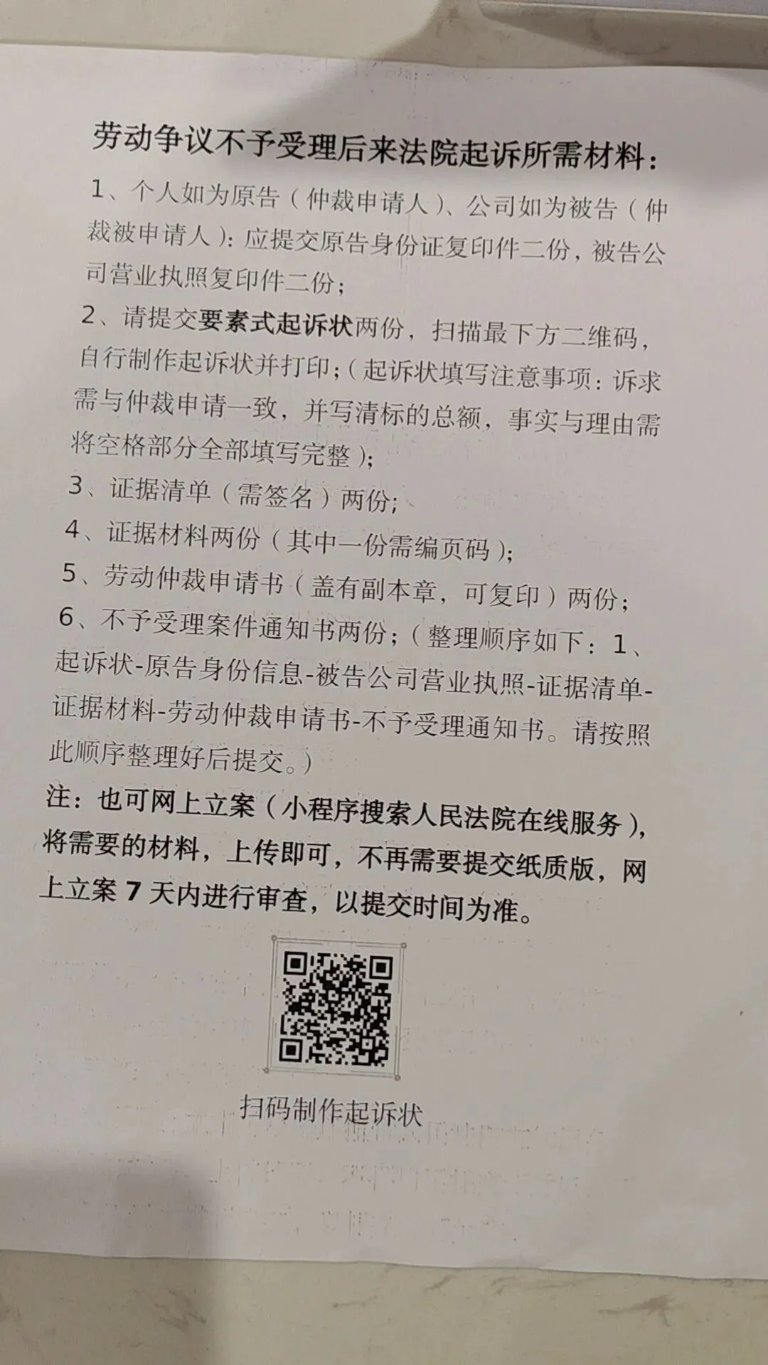 一句话总结:仲裁委这边要么补材料,要么拿不予受理通知书;拿了通知书就去隔壁法院立案。起诉状和证据目录提前备好,一份就够。