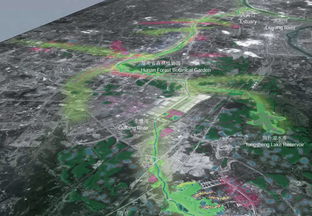 把流域内生态绿心、城市山林、滨河绿地、湿地斑块全部串联,形成贯通南北的蓝绿生态网络,对接长株潭生态绿心、湖南省森林植物园、浏阳河生态廊道。