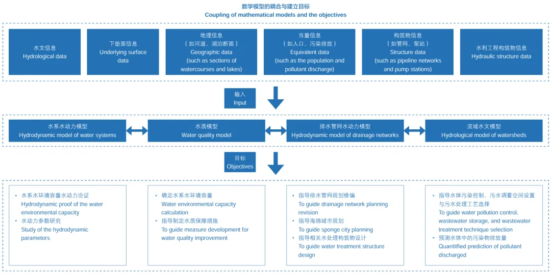 圭塘河治理涉及水系、排水、海绵、水利、景观、城市规划等多系统、多专业,传统经验规划难以精准落地。设计团队构建四大耦合数学模型,用于现状诊断、方案模拟、效果预测、投资优化。