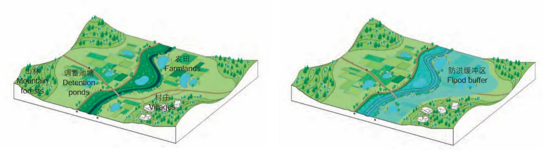 上游农田区则设置可淹没农田、蓄洪塘、缓洪沟,种植耐淹作物,利用自然地形滞洪。