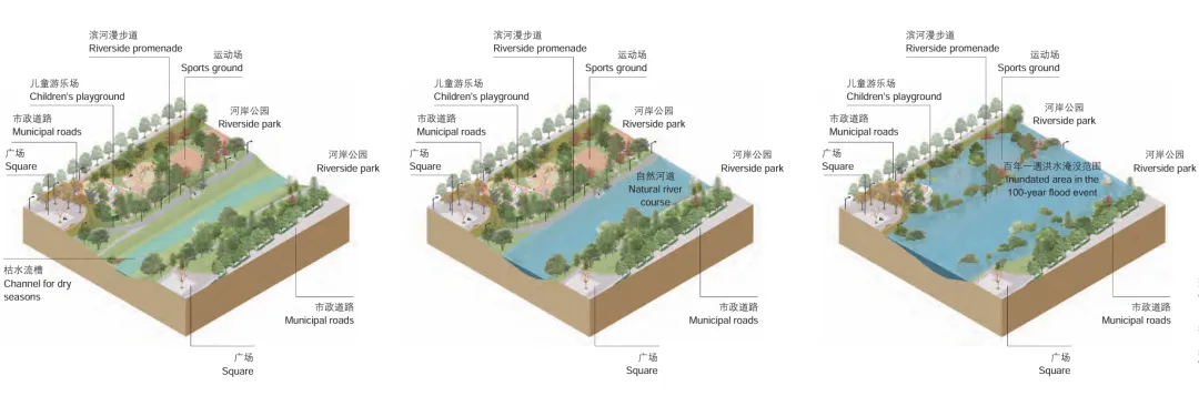 中下游河岸空间紧张,必须生态 + 社会 + 防洪复合利用。按洪水风险竖向分层布局:
