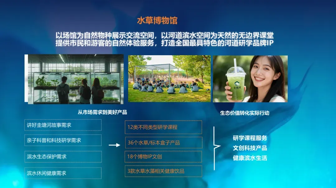 - 在地叙事:展示圭塘河原生水草种类、历史水质变化与生态修复历程,揭示水草作为“水质指示物种”的科学意义;