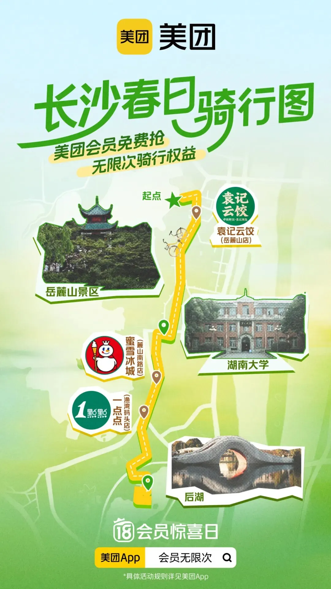 沿线部分商家参与美团会员活动,凭美团单车骑行订单+门店收藏打卡,享会员专属福利。