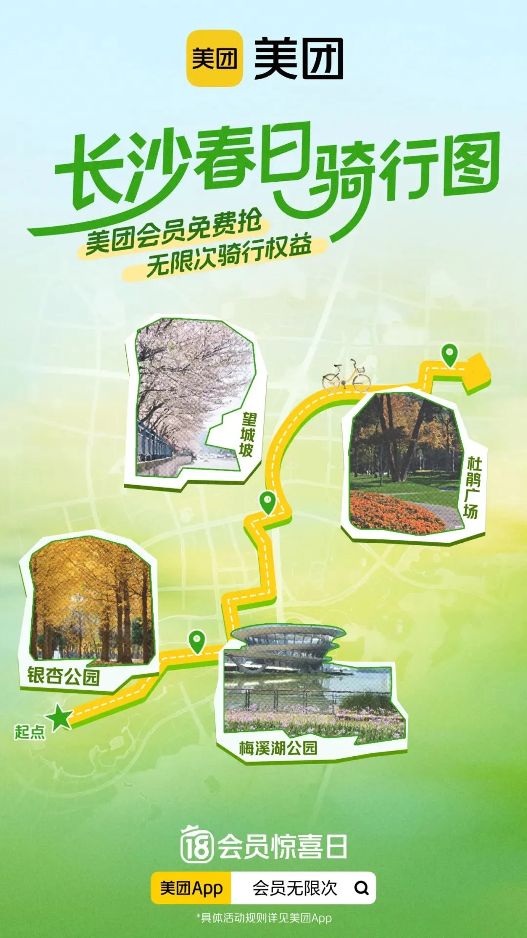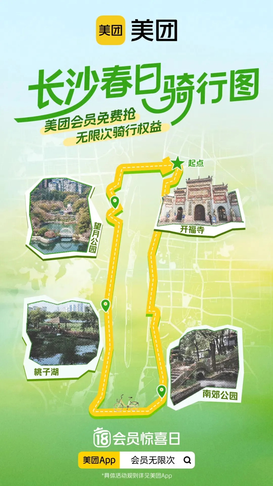 为丰富市民及游客的春日休闲体验,助力文旅消费活力提升,美团结合长沙城市文旅特色,为广大市民及游客规划三条春日精品骑行路线——从岳麓山的书香古韵,到梅溪湖的油画花海,再到湘江两岸的环线漫游,车轮过处,皆是星城限定春色。