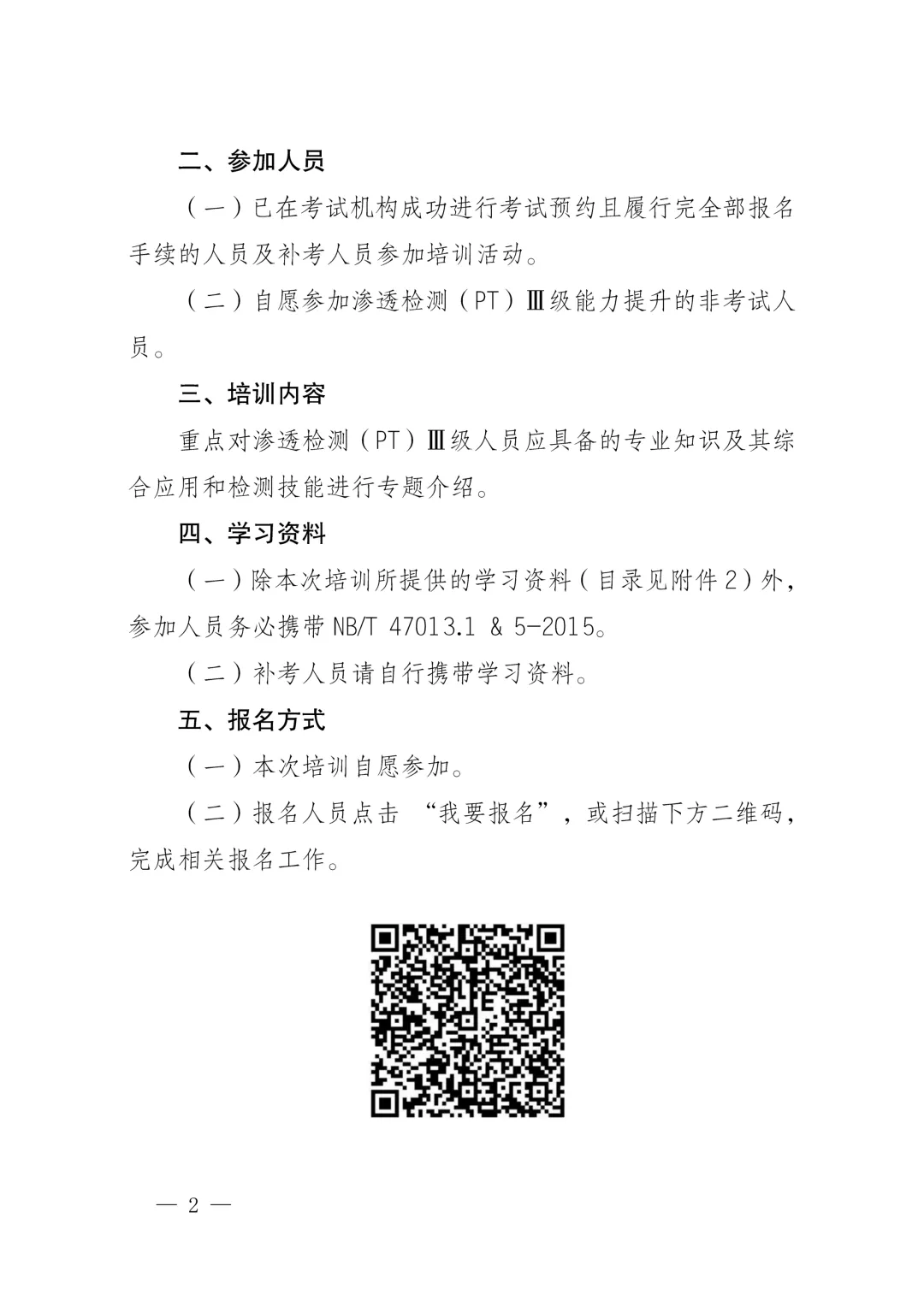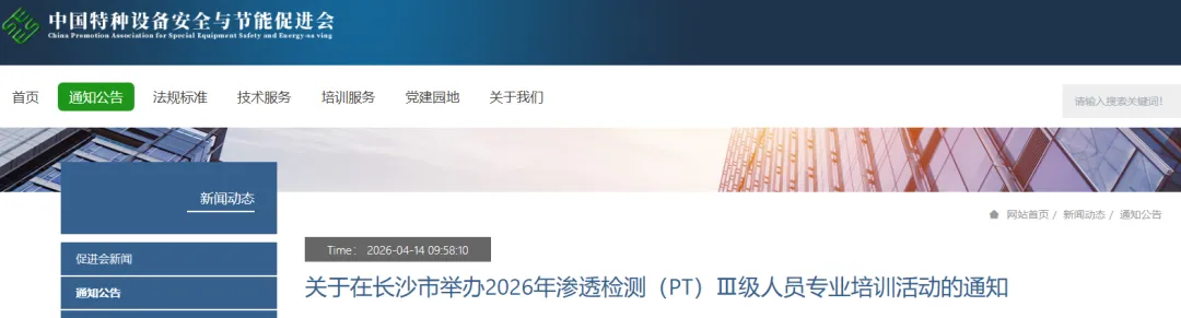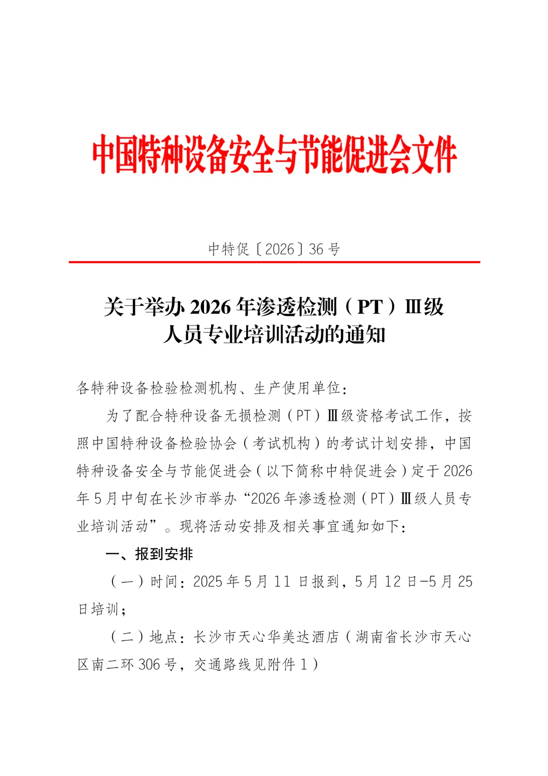 >中特促进会:关于在长沙市举办2026年渗透检测(PT)Ⅲ级人员专业培训活动的通知