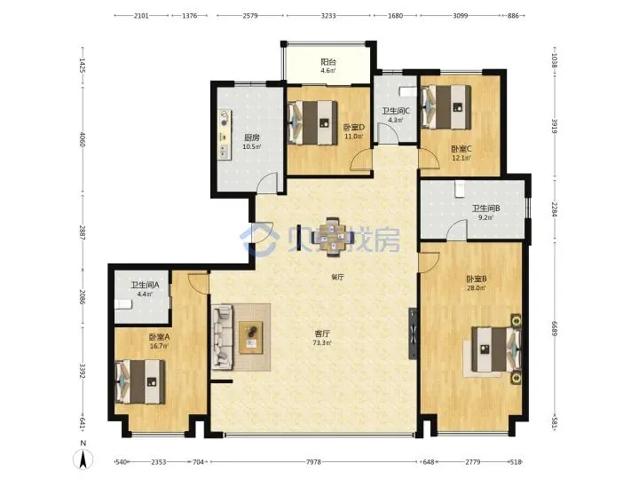 面积近219㎡,一口价452万,两梯两户板式大平层,层高3.15米,全新带装修家电,可以拎包入住。