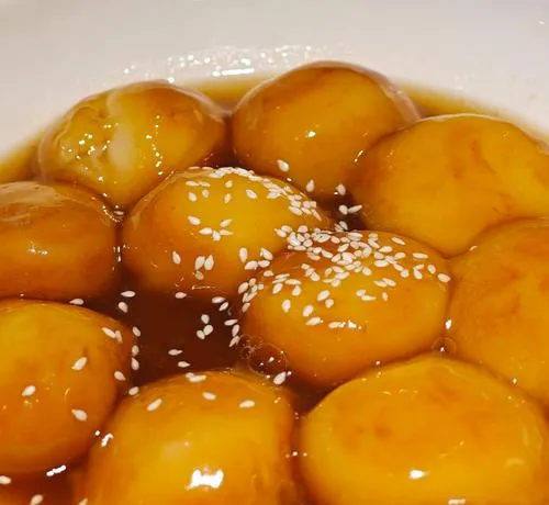 昨天去菜市场看到有卖糯米粉的,就想做这个!糯米团子炸得金黄酥脆,外脆里糯,裹上糖浆甜香软糯,一口咬下去糖汁都流出来了。糯米富含碳水化合物,能快速补充能量,做成这种小吃又香又甜,当早餐或者下午茶都特别合适呢!