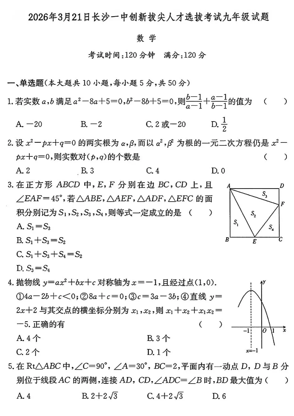 广东家长圈收集到2026年3月21日长沙一中创新拔尖人才选拔考试九年级数学试题,欢迎练习!