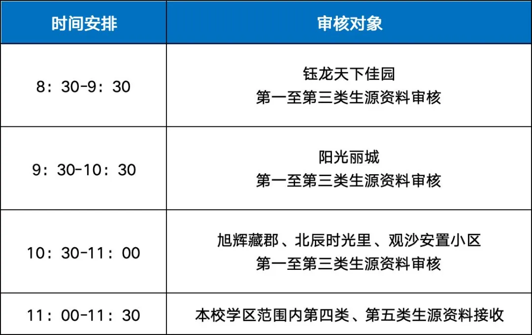 5月23日上午8:30-11:30,学区内第一至第五类生源,只需一位监护人(父亲或母亲)携带相关资料的原件及复印件(所需资料见本公告第五条;复印件按指定顺序装入档案袋;原件自带。)在麓山国际第二实验小学进行现场资料审核,签订《诚信入学承诺书》。