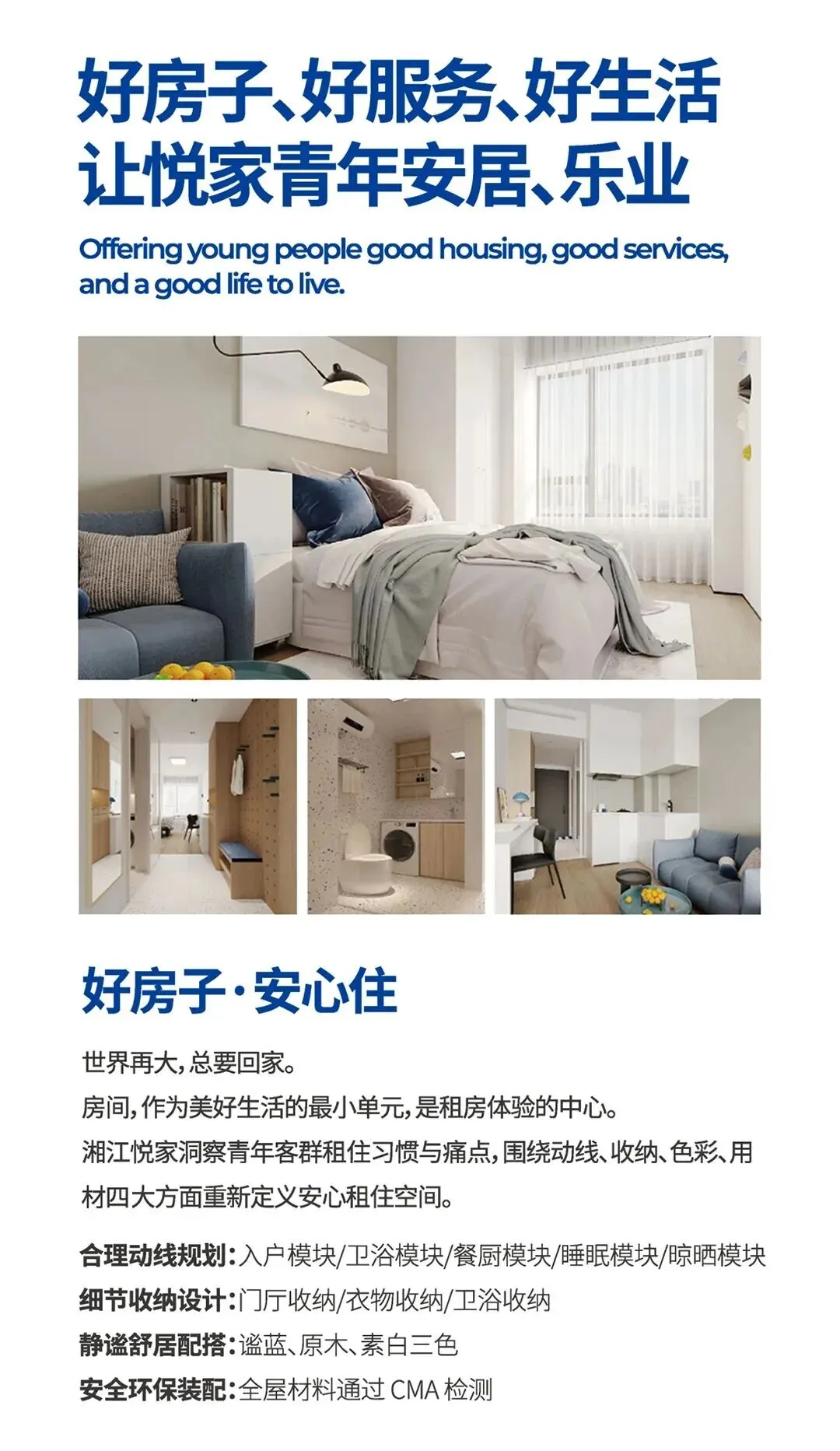 “湘江悦家”长租公寓品牌秉承「租住在长沙,安心住悦家」的品牌主张,致力于为城市青年提供高品质的居住体验,为青年人才们展开美好生活图景。以好房子、好服务、好生活三大核心价值,不仅让新长沙青年“安居”,更要在长沙“乐业”。