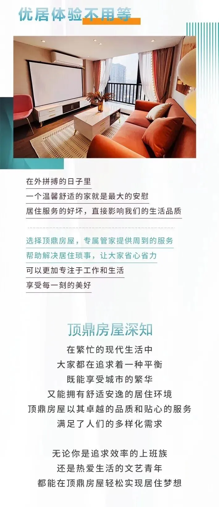 顶鼎房屋成立于2014年,历经十余年的沉淀与发展,公司逐渐形成以:存量房托管、软硬装配置、房屋出租运营、不动产增值管理为一体的综合性存量房管理运营公司。十余年来,公司励精图治,为全国各地在长沙拥有不动产的业主,提供专业的托管、租赁、装修服务,并广受好评。公司曾先后荣获:年度住建部中国十佳分散式品牌公寓奖、年度最具人气品牌公寓奖等。现为长沙市住房租赁行业协会发起单位兼副会长单位,且被授予“住房租赁行业信用等级壹级企业”。