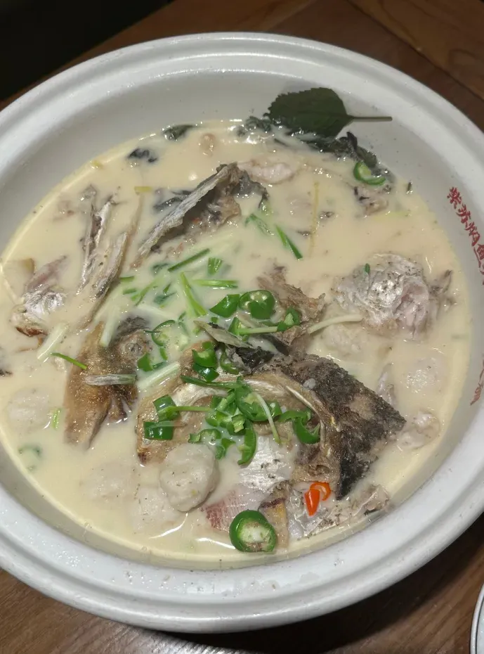 点了一份黄焖草鱼。汤底是奶白色的,带着微辣,刚好盖过鱼腥味,鲜到眉毛掉下来。我本人对湘颂的饭稻羹鱼念念不忘,但这锅鱼汤,让我瞬间“变心”。