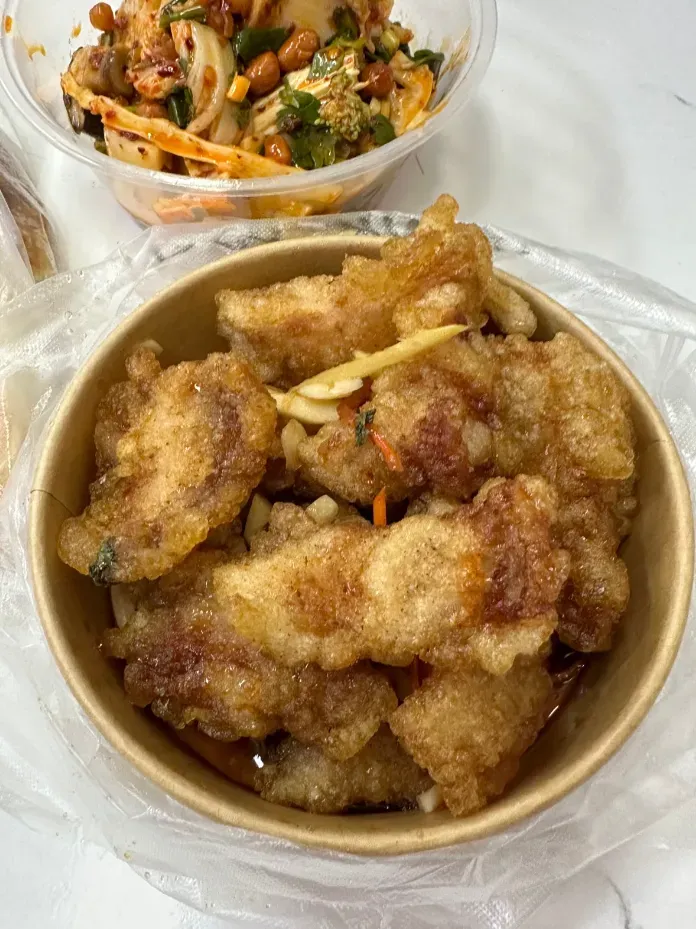 第一家:东北锅包肉。 点了份小的老式锅包肉,酥脆的外皮下,裹着一层糯糯的粉,最里面是猪肉。别看是小份,根本吃不完。