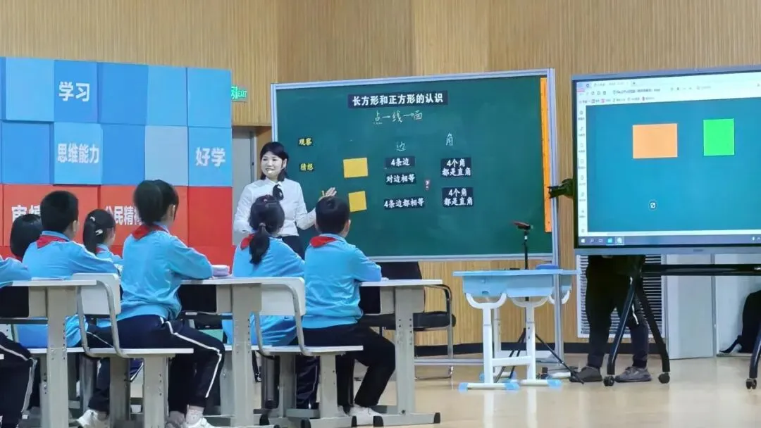 从她的课堂呈现来看,团队对学情的了解非常到位——根据试教、磨课来发现学生的真实困惑,设计有针对性的前置练习,找到教学的起点。对知识的结构化处理也是清晰明了:从初步的整体感知长方形和正方形的特征,到聚焦“边”和“角”两个要素进行深入研究,引导学生的认知从感性上升到理性。