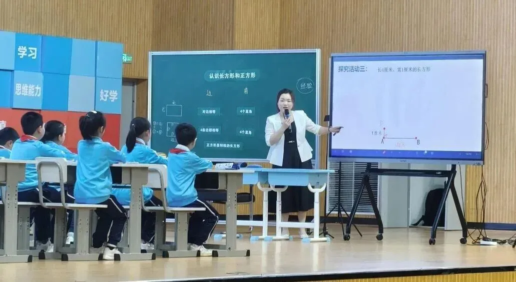 下午展示的课采用“同课异构”形式,课题为人教版三年级下册《长方形和正方形的认识》。“同课异构”的魅力就在于:同一个课题,不同的教学设计,却同样指向核心素养的培育。两位老师,两种思路,两样精彩。