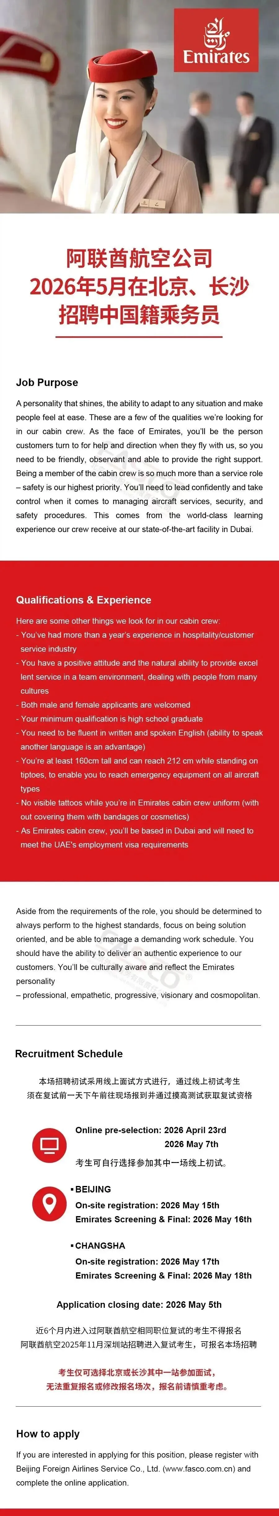 >阿联酋航空公司5月在北京、长沙招聘中国籍乘务员