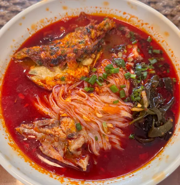郴州的食物没有长沙名气大。但是有正宗的本地味道。第一种是栖凤渡鱼粉。厨师用新鲜鱼肉熬成白色鱼汤。碗里加上煮熟的米粉和酸菜。喝一口热鱼汤味道十分鲜美。