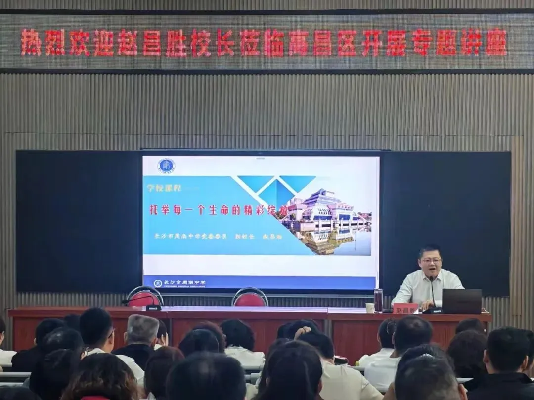 长沙市周南中学党委委员、副校长、工作站站长赵昌胜以《学校课程:托举每一个生命的精彩绽放》为题做专题讲座,分享周南中学课程体系建设的经验,详解“三心三层六翼”课程体系、“5E”教学范式及多元评价体系,为学校课程改革提供可落地的实践方案。高昌区中小学校百余名校领导及教务教研主任参加了此次讲座,反响热烈。