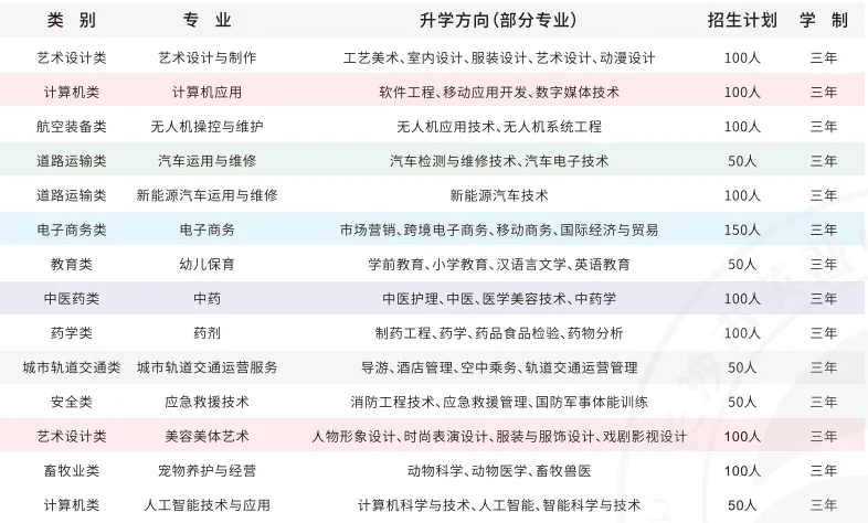 学校开设有艺术设计与制作、计算机应用、无人机操控与维护、汽车运用与维修、新能源汽车运用与维修、电子商务、幼儿保育、中药、药剂、城市轨道交通运营服务、应急救援技术、美容美体艺术、宠物养护与经营、人工智能技术与应用等热门专业,有各类实训室(中心)50多个,与20多所高校建立对口升学和人才培养合作关系,对口升学稳定在98%以上;与100多家知名企业深度校企合作,学生就业率100%。咨