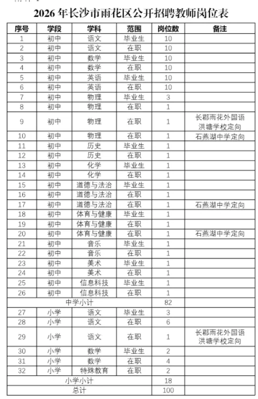 本次公开招聘教师岗位32个、计划100名。