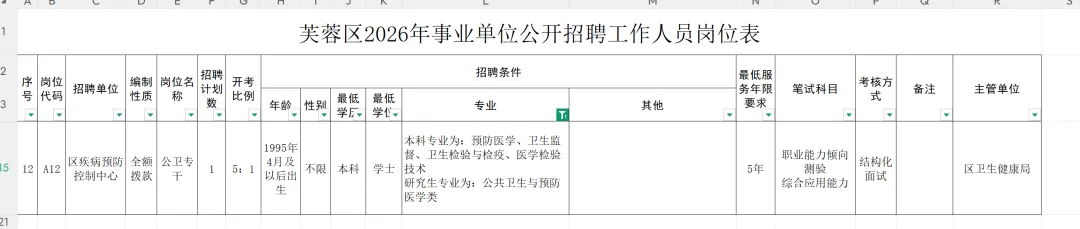 此次招聘岗位16个,招聘计划20名,详见附件1:《芙蓉区2026年事业单位公开招聘工作人员岗位表》
