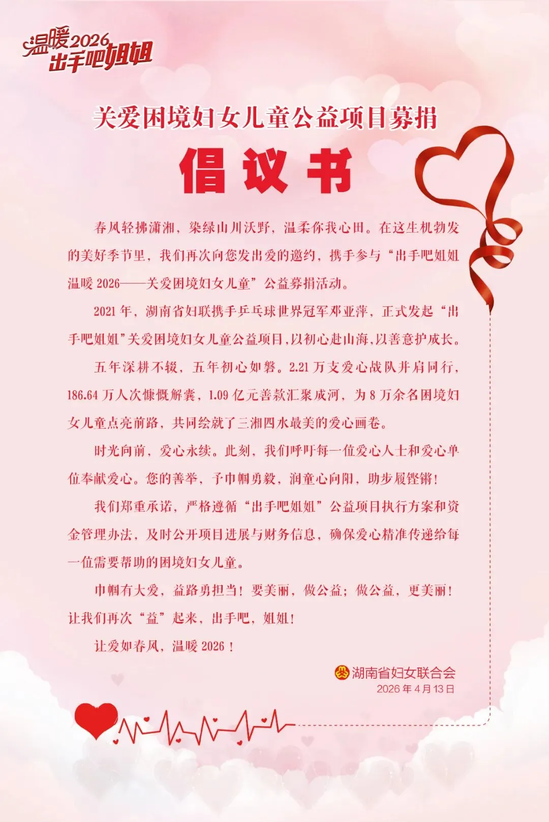 春风送暖,万物向阳。在这充满生机与希望的时节,湖南省“出手吧姐姐 温暖2026——关爱困境妇女儿童”公益项目温暖启航。作为品牌公益项目,今年已是第六年以爱之名汇聚公益力量。爱心无大小,善举暖人心。诚邀您扫码加入长沙县安沙镇战队,用实际行动关爱困境妇女儿童,让善意在春日里绵延不息。