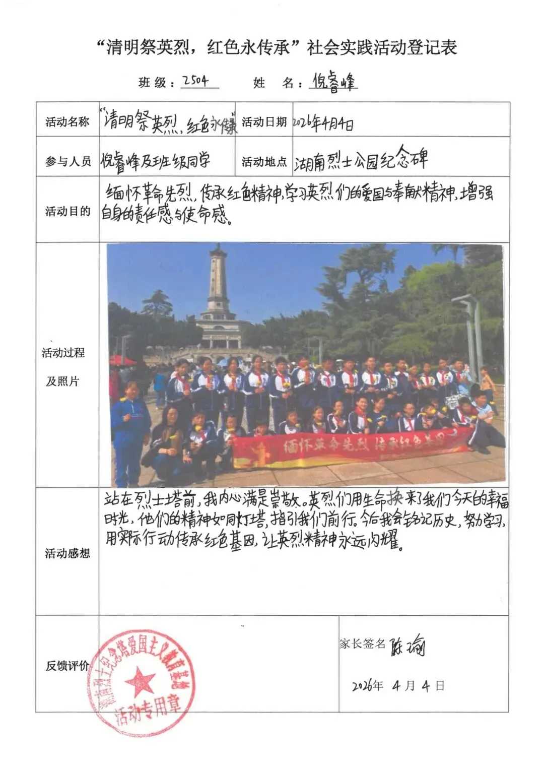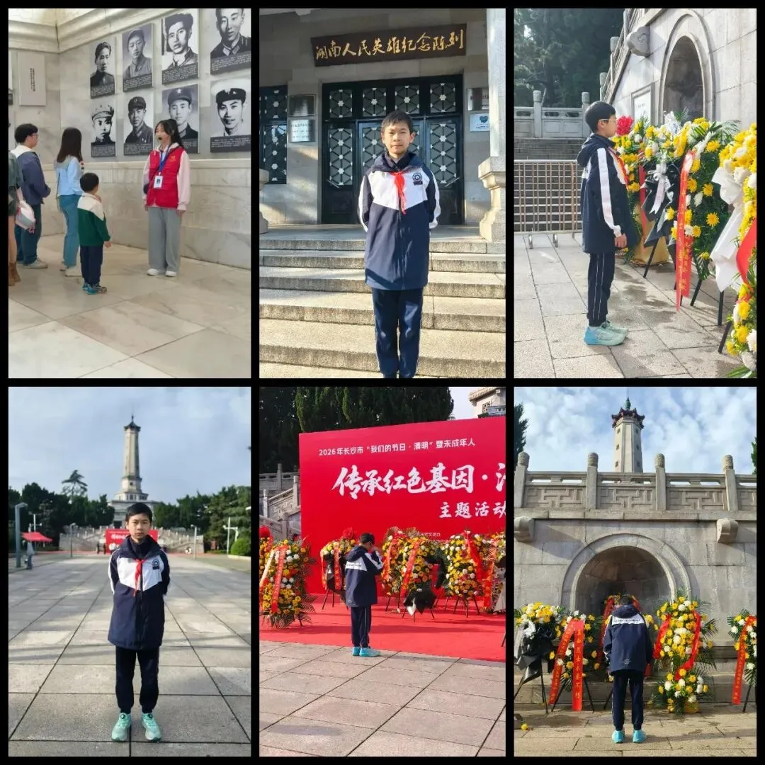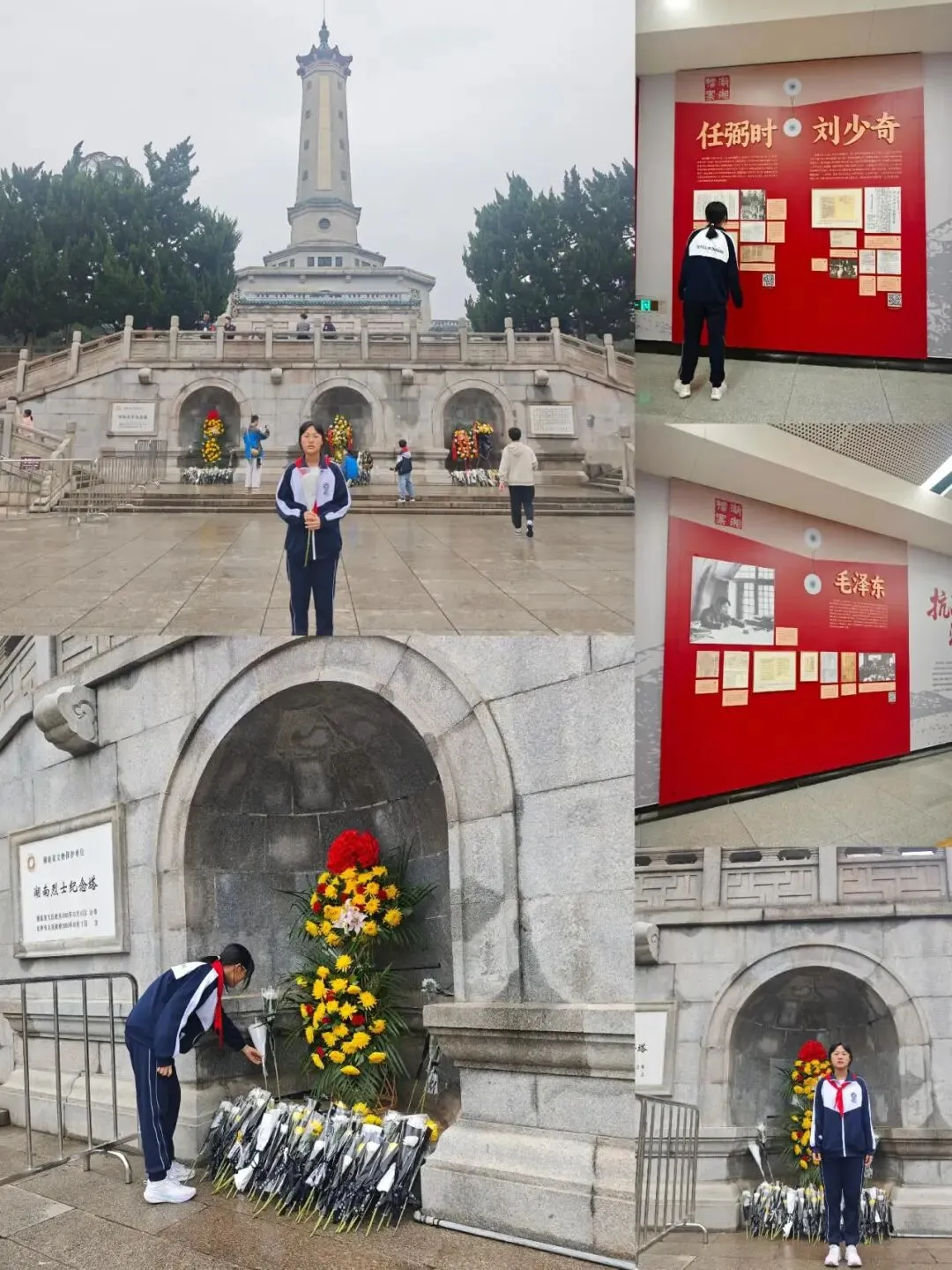 活动中,同学们身着整洁校服、佩戴红领巾,前往烈士纪念碑、革命烈士纪念馆等地开展祭扫与红色寻访活动。其中,2504班、2508班全体同学集体来到湖南烈士公园,在烈士纪念碑前庄严祭扫。大家在烈士纪念碑前肃立默哀、敬献鲜花,以庄重的仪表和真诚的行动表达对革命先烈的深切缅怀。没有说教,只有静默与敬意——这一刻,历史不再是书本上的文字,而是触手可及的精神力量。