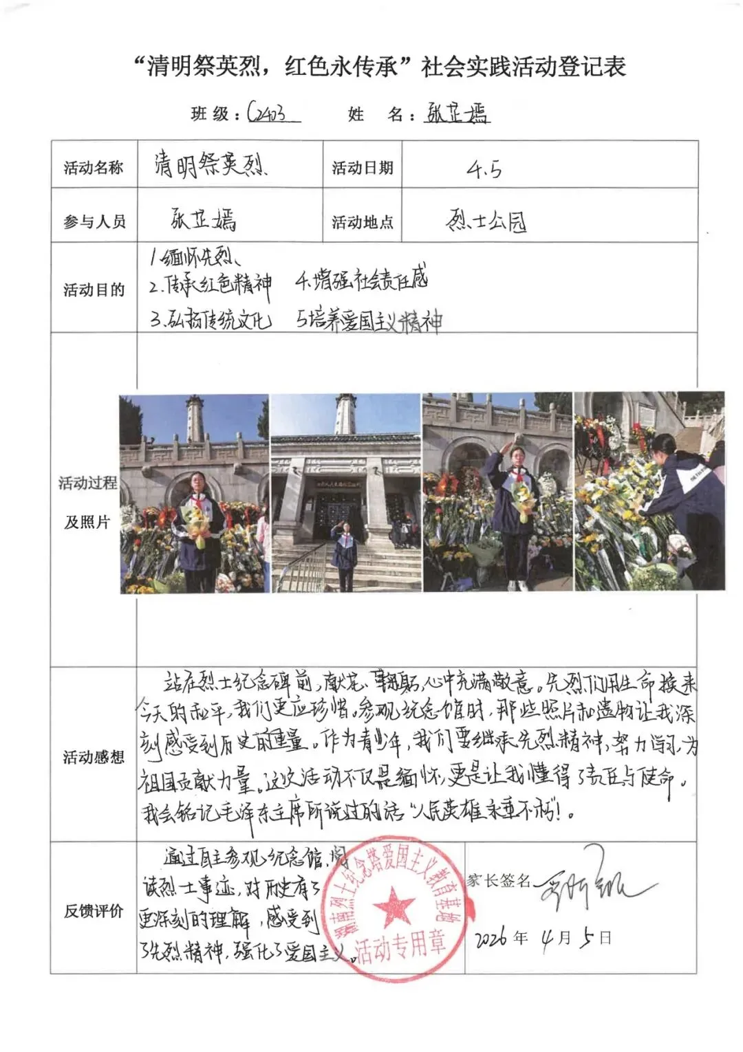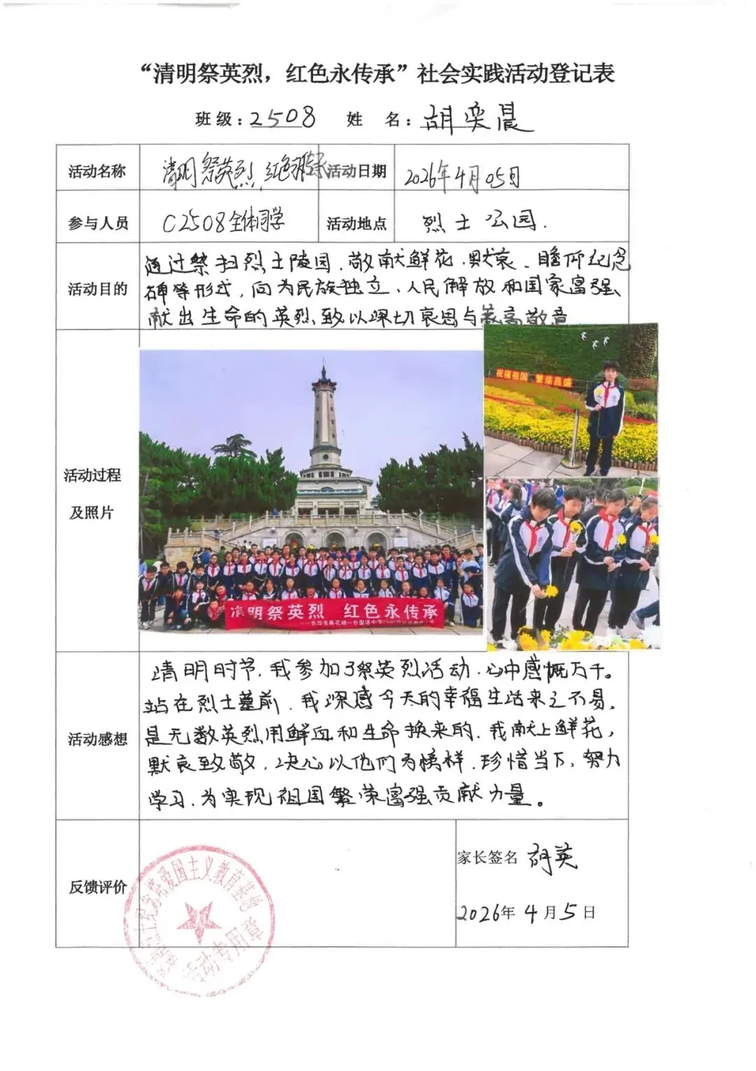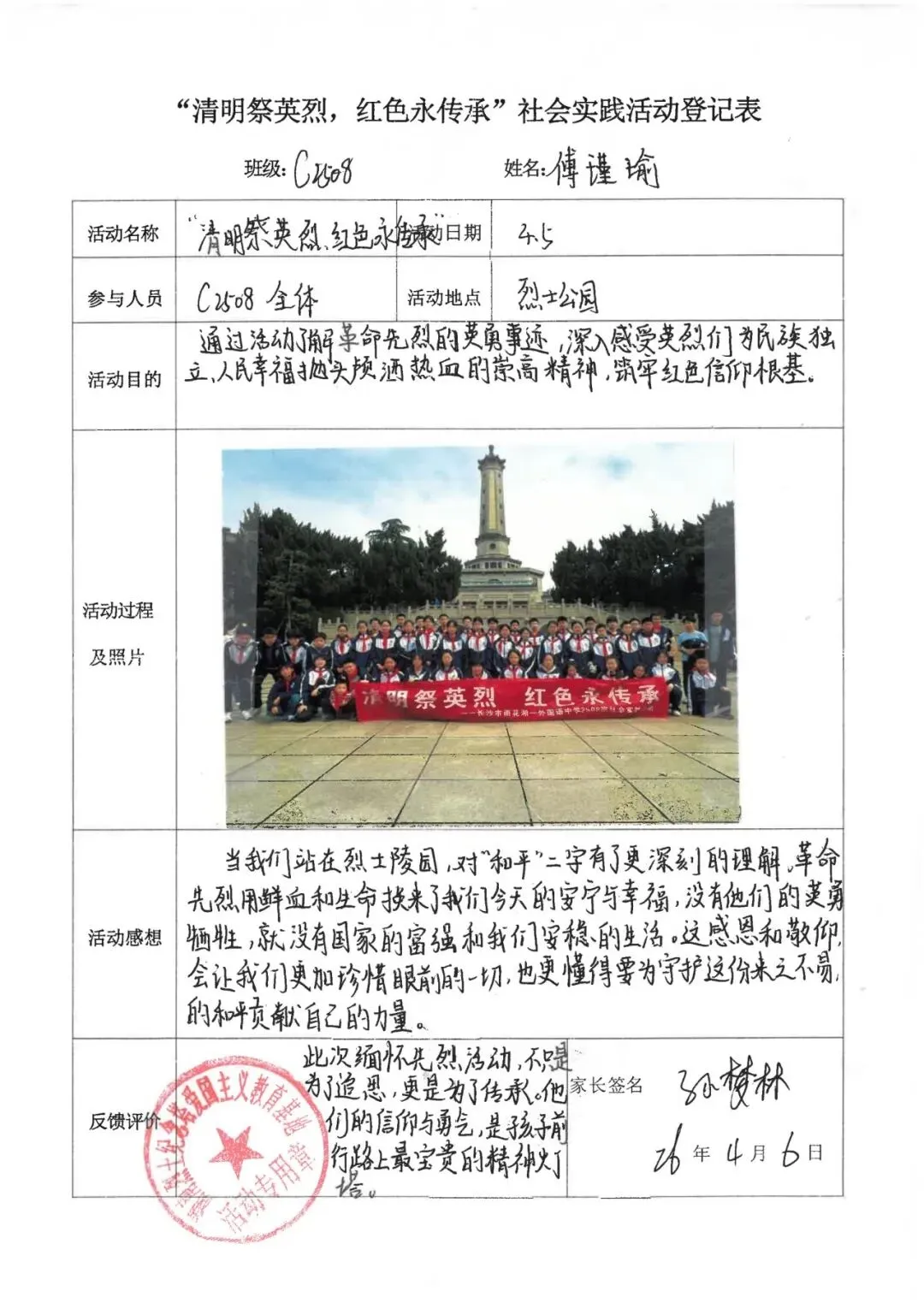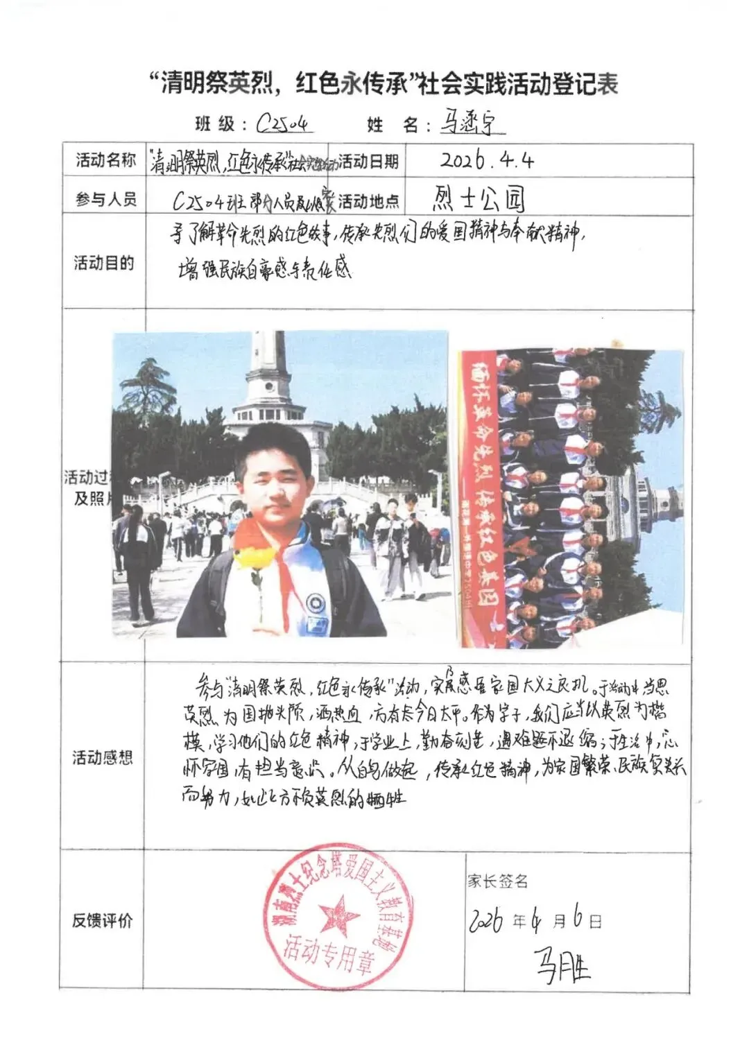 返校后,同学们认真填写并上交了《“清明祭英烈,红色永传承”社会实践活动登记表》,用文字和照片记录下自己的所见、所思、所感。透过一份份登记表,可以清晰地看到这堂“思政课”带给同学们的丰厚收获:在行走中感知历史的温度,在仪式中接受精神的洗礼,在思考中明确责任的方向。