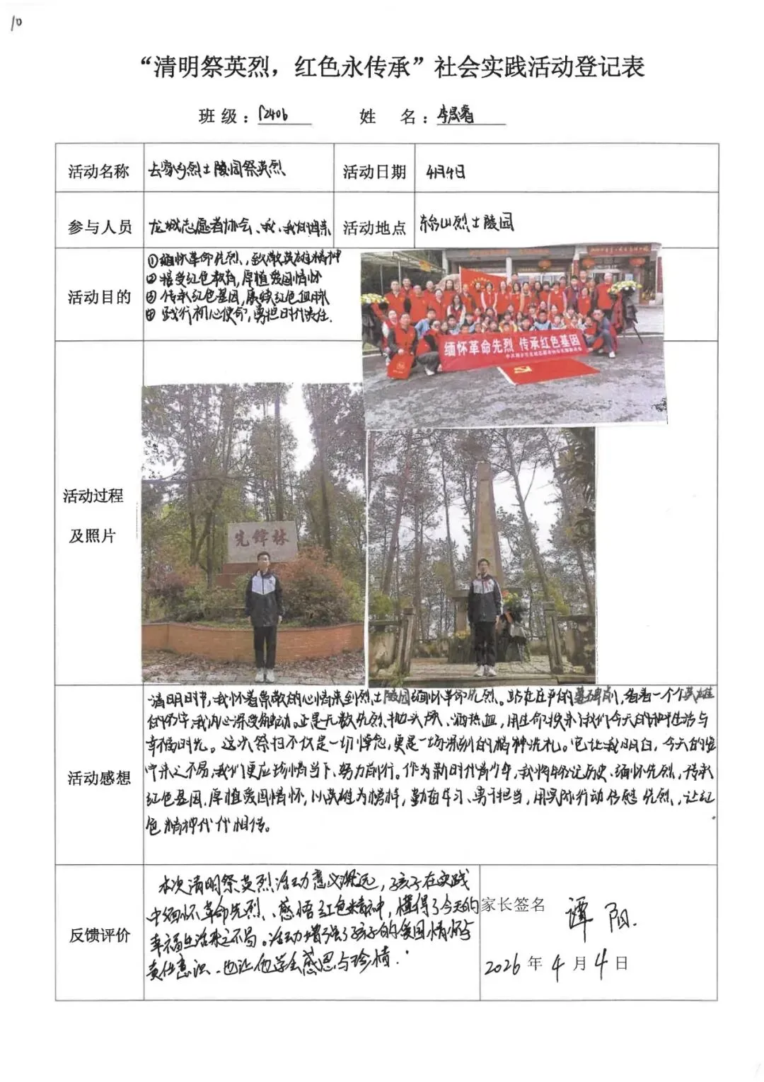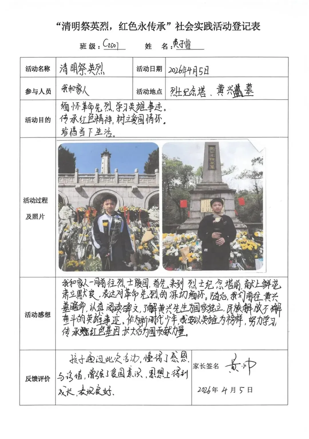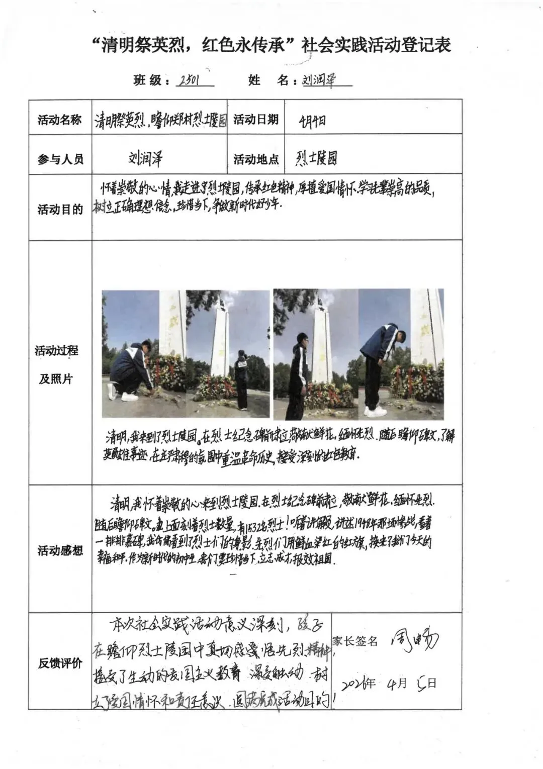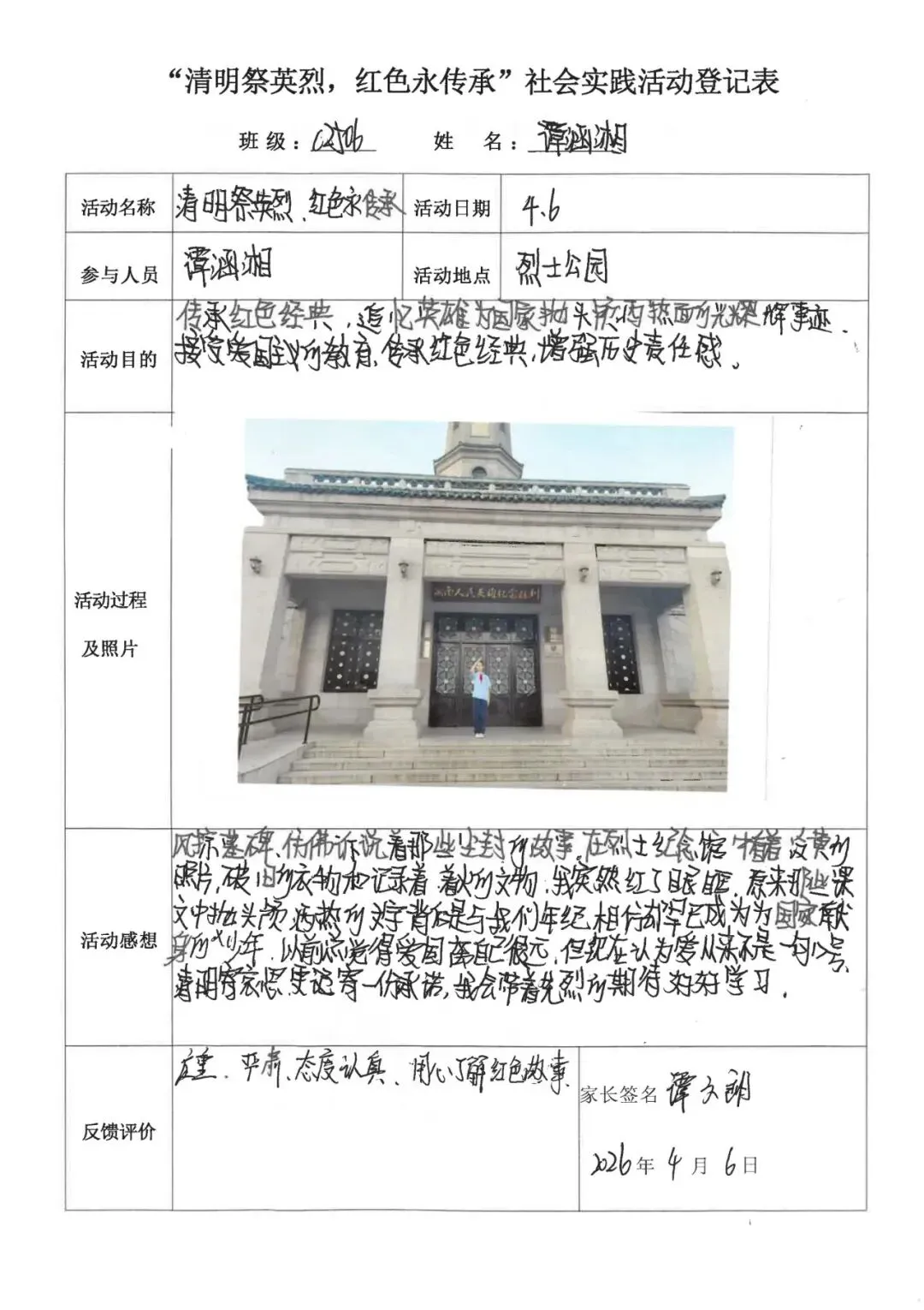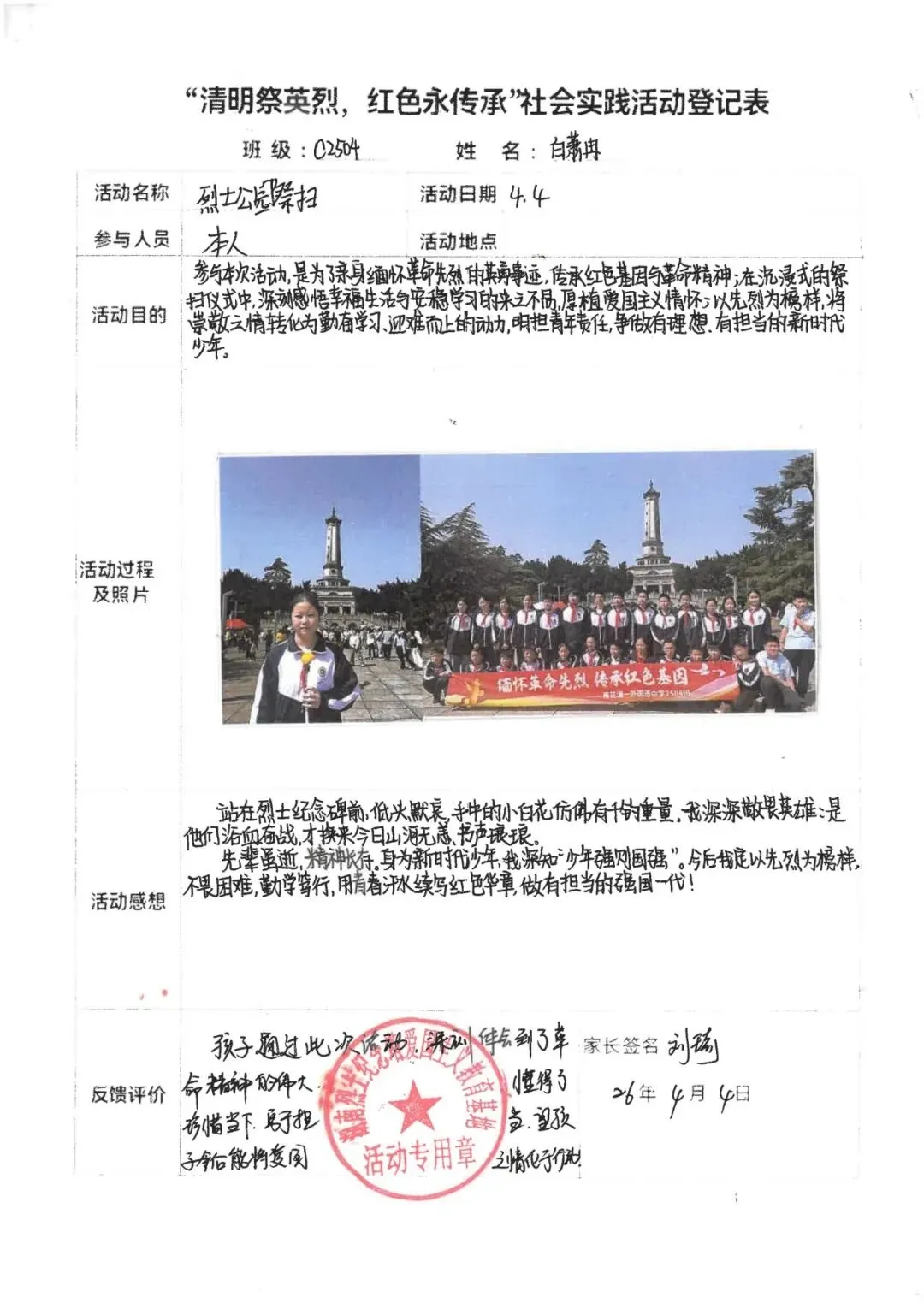返校后,同学们认真填写并上交了《“清明祭英烈,红色永传承”社会实践活动登记表》,用文字和照片记录下自己的所见、所思、所感。透过一份份登记表,可以清晰地看到这堂“思政课”带给同学们的丰厚收获:在行走中感知历史的温度,在仪式中接受精神的洗礼,在思考中明确责任的方向。