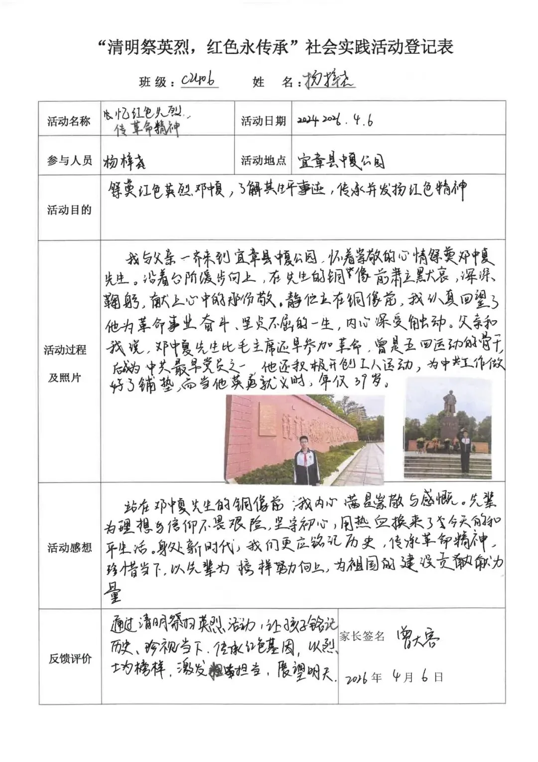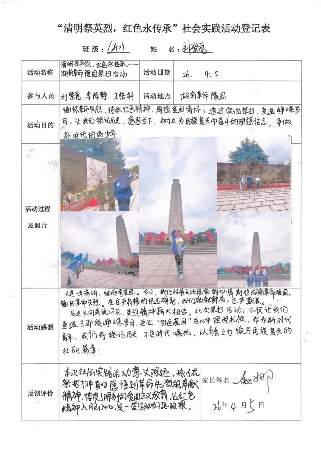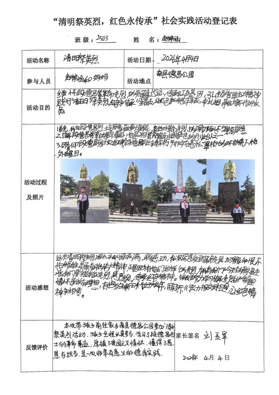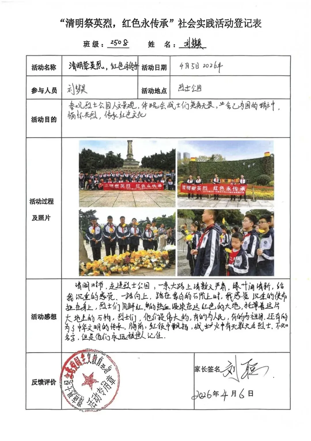 返校后,同学们认真填写并上交了《“清明祭英烈,红色永传承”社会实践活动登记表》,用文字和照片记录下自己的所见、所思、所感。透过一份份登记表,可以清晰地看到这堂“思政课”带给同学们的丰厚收获:在行走中感知历史的温度,在仪式中接受精神的洗礼,在思考中明确责任的方向。