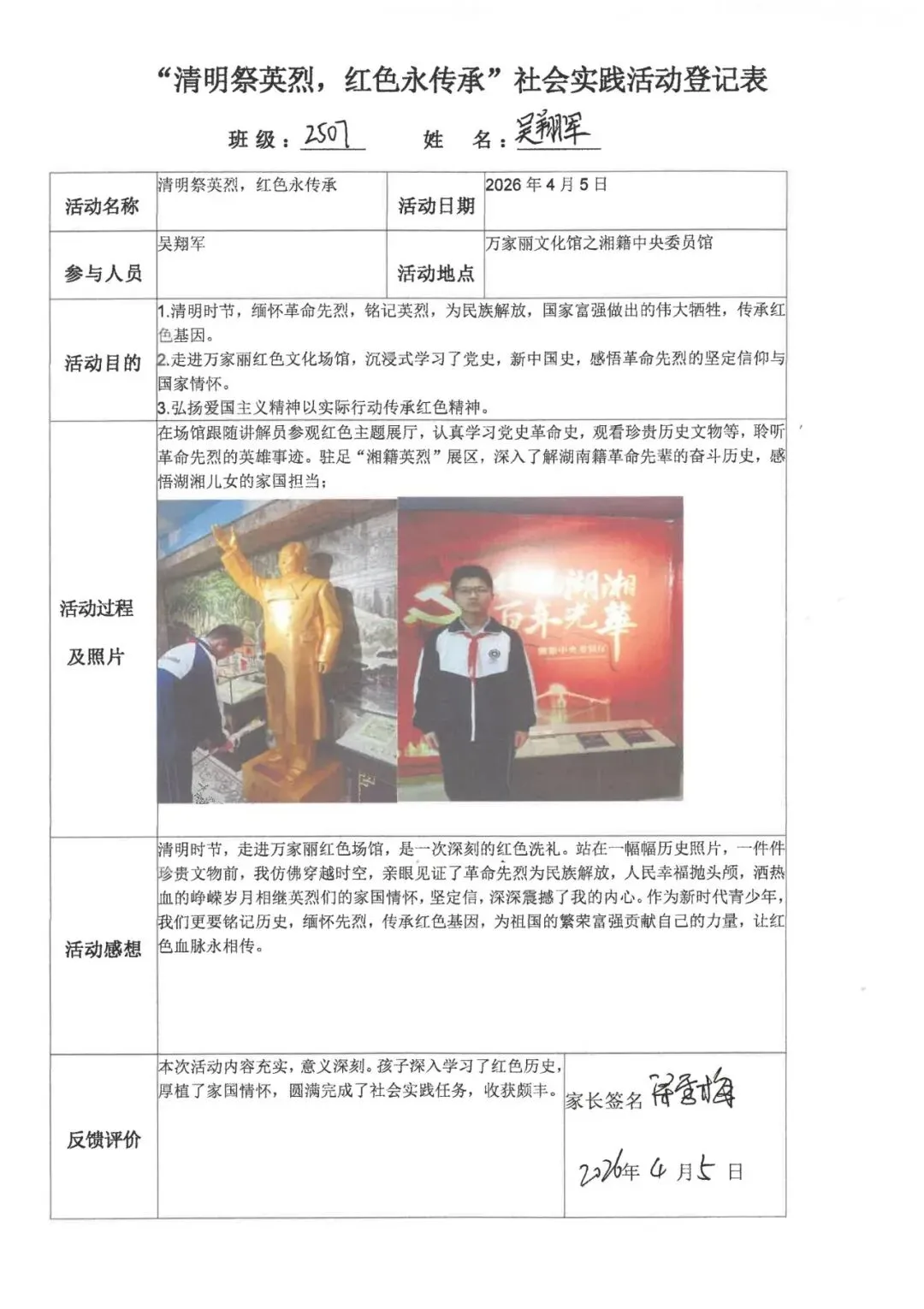 这堂“行走的思政课”,没有固定的教室,却处处是课堂;没有刻板的教材,却处处有真理。同学们在祭扫中静思,在寻访中感动,在实践中成长,在心中树起了一座座“红色的丰碑”。长沙市雨花湘一外国语中学将继续以传统节日和红色资源为载体,推动思政教育走深走实、入脑入心,让革命精神在青少年心中薪火相传。