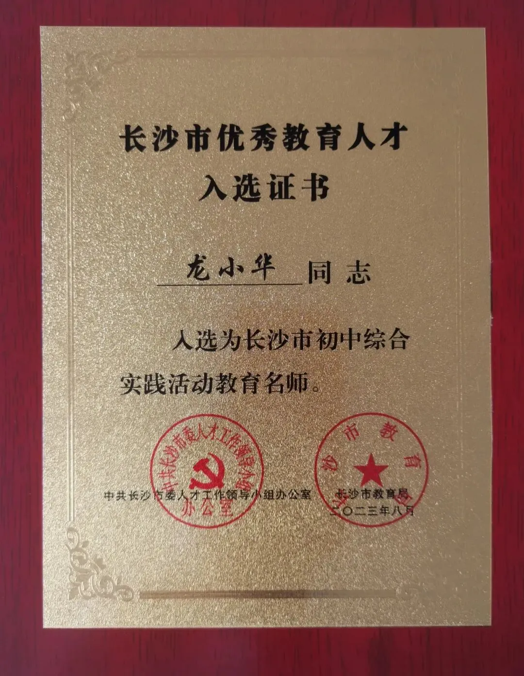 龙小华,全国中小学生信息素养提升实践活动评审专家,全国中小学生电脑制作活动优秀指导老师,全国青少年无人机竞赛优秀指导老师,湖南省青少年机器人竞赛优秀指导老师,湖南省第二届“科普小达人”综合实践活动先进个人,长沙市科技教育协会副秘书长,龙小华科技创新名师工作室首席名师。