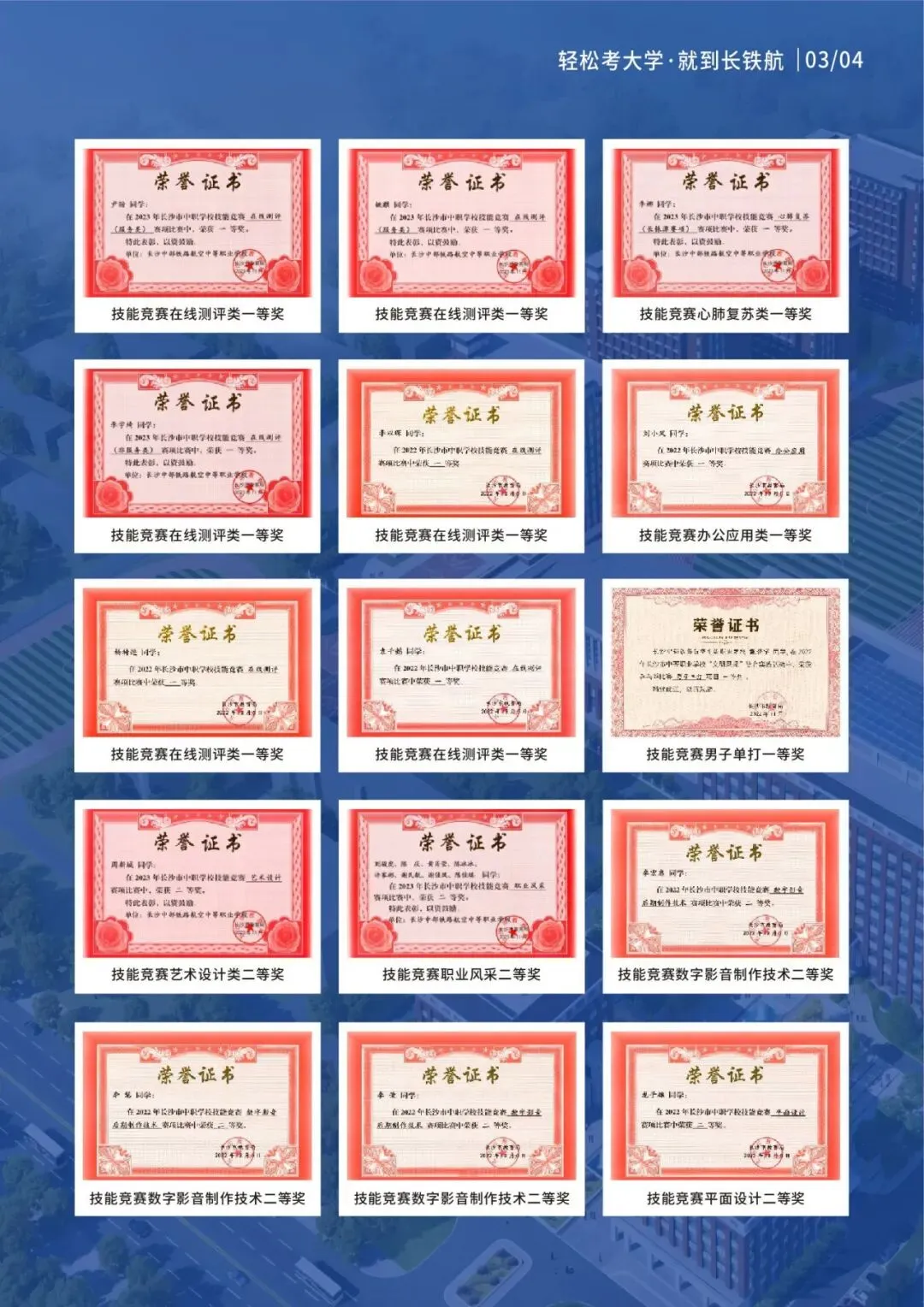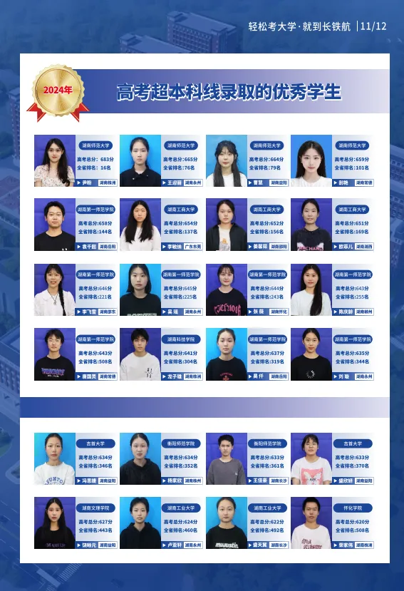 2021、2022、2023、2024届单招升学班毕业生中,2000多名学生通过单招考试被长沙民政职业技术学院、长沙航空职业技术学院、湖南交通职业技术学院等知名大专院校录取。