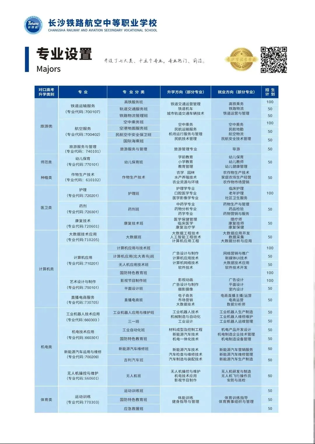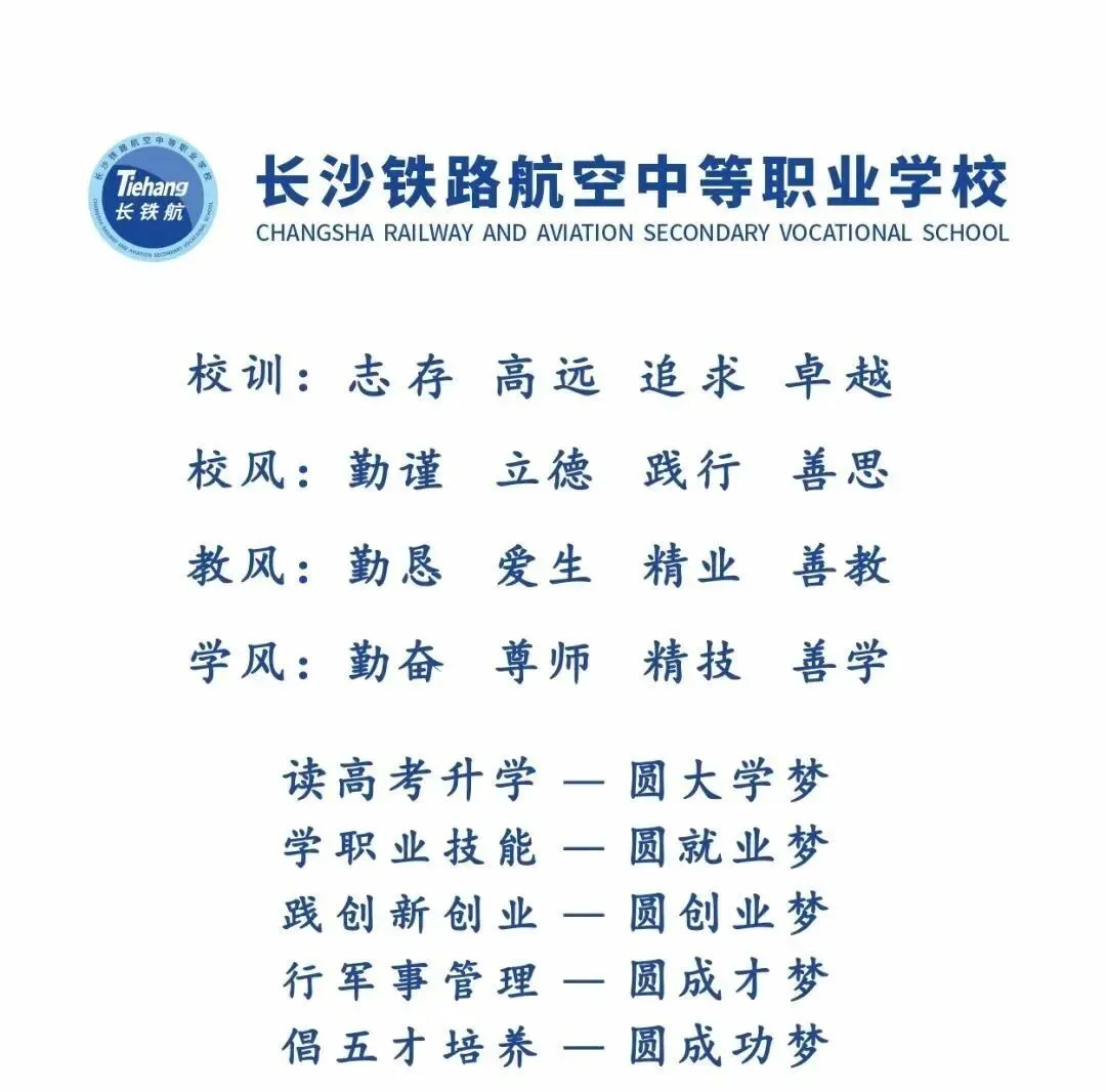 长沙铁路航空中等职业学校(简称“长铁航”)是经国家教育部、湖南省教育厅备案,长沙市教育局批准设立并主管的一所以“对口高考升学”为重点,以交通运输类、医卫类、教育类等专业群为特色,升学与就业协同发展的全日制中等职业学校。学校坐落在历史文化名城——湖南省会长沙,校址位于全国排名前十的国家级经济技术开发区长沙经开区的核心区域“星沙大学城”中心地带,东依湖南警察学院、北临湖南艺术职业学院、西接长沙电力职业技术学院、南靠湖南农业大学,区位优势得天独厚,交通便利,校园环境优美,更有三湘最大城市湖泊松雅湖秀丽的景观相伴学涯,是莘莘学子梦寐以求的求学圣地、科教殿堂。