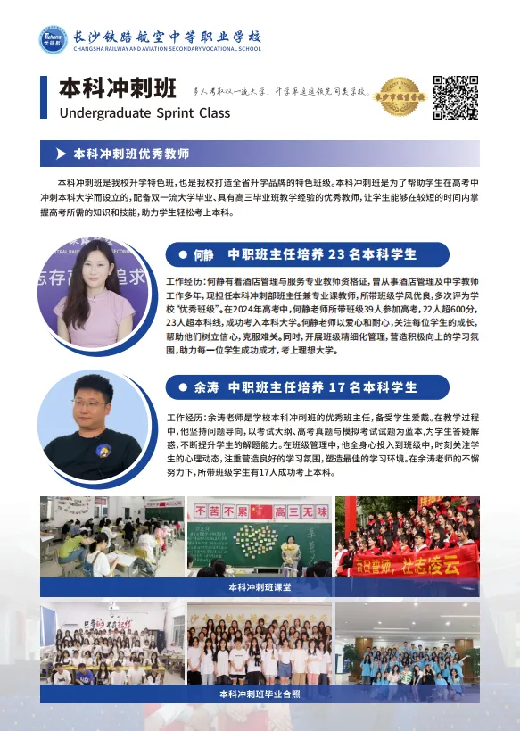 我校开设本科冲刺班,学⽣通过入学考试,从每个专业中挑选成绩优秀的学⽣,成立本科冲刺班。本科冲刺班以考取本科院校为⽬标,聘用双一流名校毕业的优秀教师教学,紧扣对口⾼考最新试题,分析考点、难点和易错点,提⾼学⽣的学习效率和考试成绩。通过专业分类因材施教,突击重点,助力学生考取本科院校,圆学生双⼀流梦想。