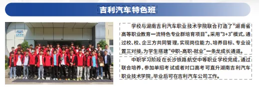 学校与湖南吉利汽⻋职业技术学院联合打造了“湖南省⾼等职业教育⼀流特色专业群培育项目”。采⽤“3+3”模式,通过校、校、企三⽅共同管理,实现岗位能力、培养目标、专业设置三对接,为学⽣搭建“中职-⾼职-就业”⼀条龙成⻓通道。中职学习阶段在长沙铁路航空中等职业学校完成,通过联合培养,参加单招考试或者对口⾼考可直升湖南吉利汽⻋职业技术学院,毕业后可在吉利汽车公司工作。