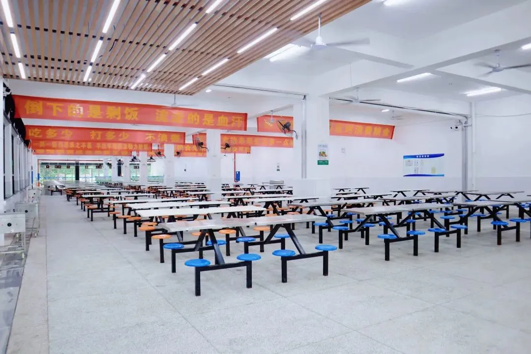 学校建有可容纳近2000⼈同时就餐的⻝堂,菜品丰富多样,荤素搭配,使学⽣营养搭配均匀,同时⻝堂配备免费加菜窗口,确保学⽣吃饱吃好。同时我校实行全员陪餐制度,学生与老师同吃同学,不分彼此。