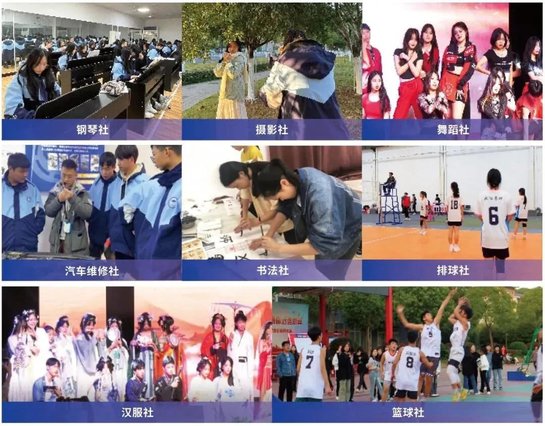 学校设有 20 多个社团。主要社团有⼿⼯社、美术社、舞蹈社、龙狮社、汉服社、乒乓球社、礼仪社、书法社、排球社、动漫社、篮球社、棋艺社、滑板社、田径社、羽⽑球社、音乐社、轮滑社、跆拳道社等。学生可以在课余时间参与各种社团活动,发展自己的爱好,同时也为学校增添⼀份活力。