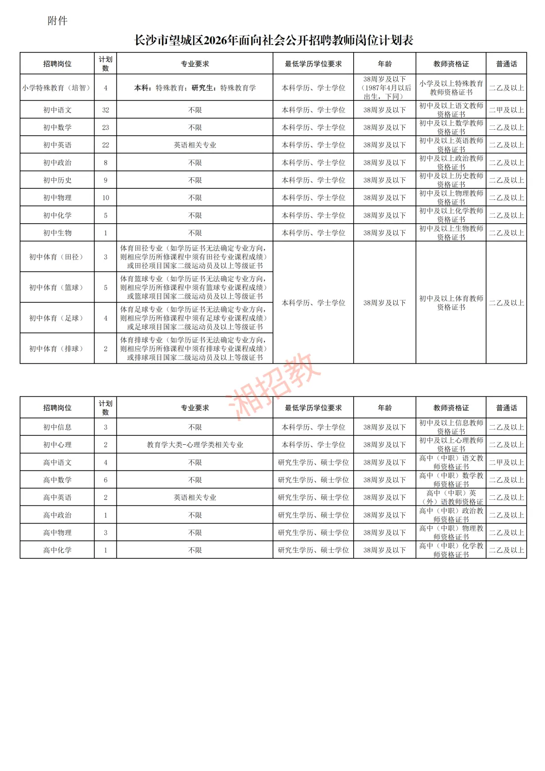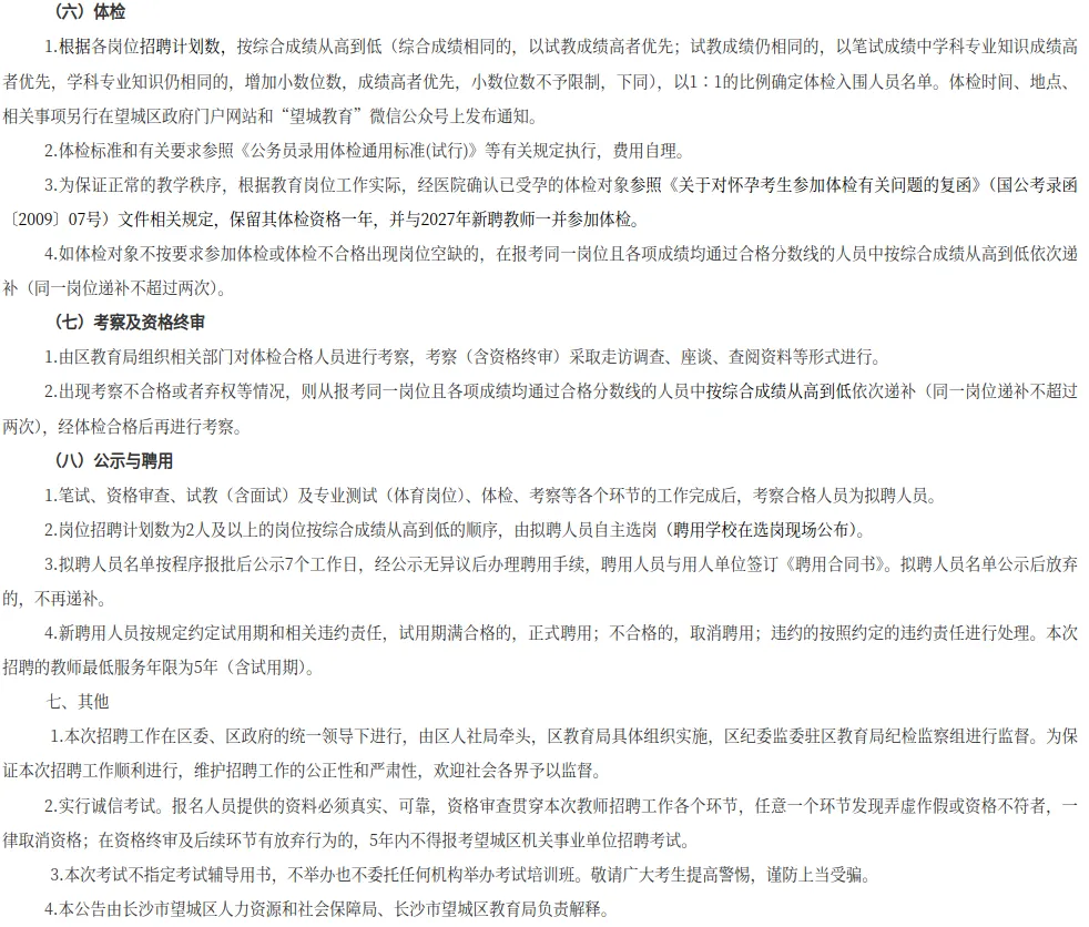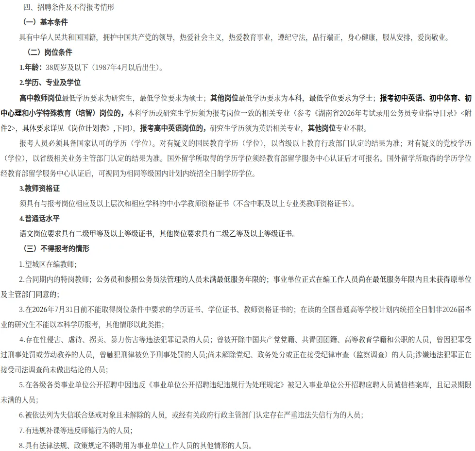 招聘岗位、计划数等详见附件《长沙市望城区2026年面向社会公开招聘教师岗位计划表》(附件1,以下简称《岗位计划表》)。