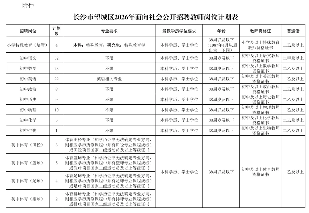 招聘岗位、计划数等详见附件《长沙市望城区2026年面向社会公开招聘教师岗位计划表》(附件1,以下简称《岗位计划表》)。