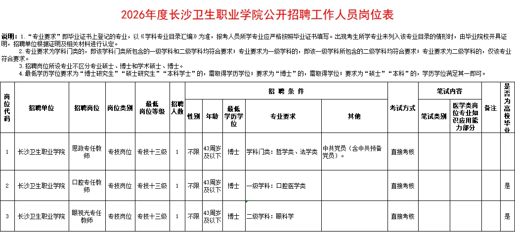 转发《2026年长沙市卫生健康委员会直属事业单位公开招聘工作人员公告》,根据《事业单位人事管理条例》(国务院令652号)及有关规定,结合我校工作需要,经市委机构编制委员会办公室、市人力资源和社会保障局批准,决定面向社会公开招聘事业单位工作人员3名。现将有关事项公布如下: