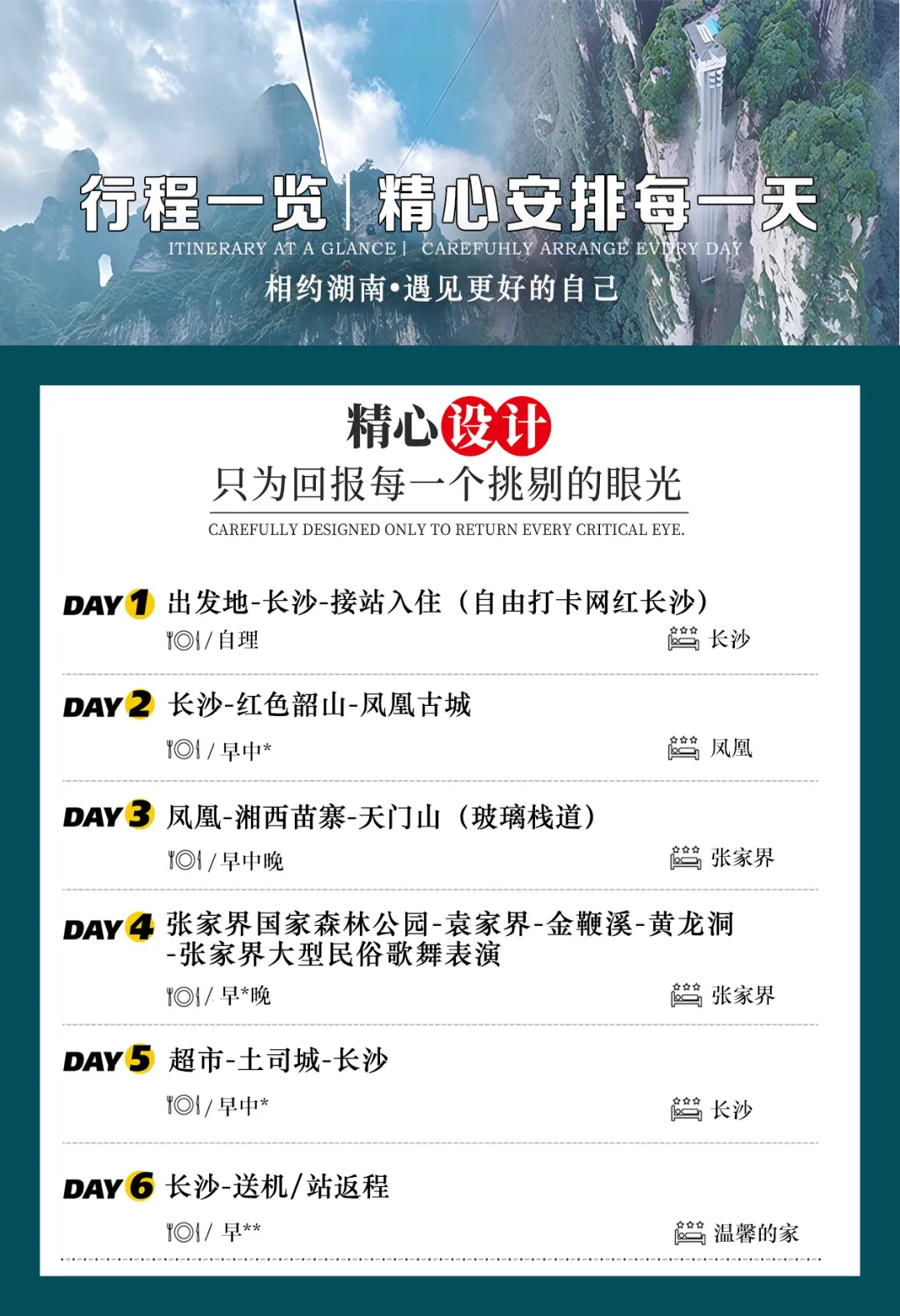 尊敬的贵宾,您的专属《玩转张家界》体验之旅安排就绪,目的地乘机/动高赴长沙,专业接机站人员举接站牌接站,后赴市区,入住酒店!