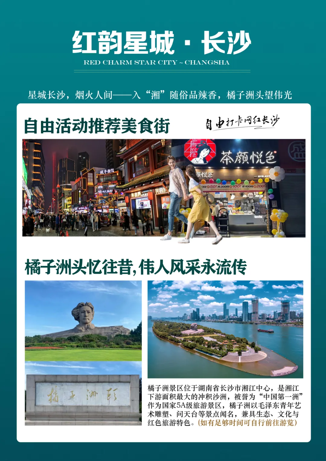 如有足够时间可自行前往拥有1200多年历史的千年老街【坡子街】,每逢节庆,这里都会举行大规模的民俗活动,热闹非凡。从明清到近代,坡子街内闻名于世的老字号达68家,成为长沙商业繁荣的象征。如今的坡子街作为长沙美食小吃的汇集地,长沙臭豆腐,糖油粑粑,茶颜悦色,文和友,风靡全国,已成为了中国四大小吃街之首。尤其是老字号【火宫殿】,以“火庙文化”为底蕴,辅以名品素食,以其独特的风格使历代名人仰慕纷纷慕名而来。亦或自由逛【橘子洲】、【岳麓山】,品阅湖湘风骚!