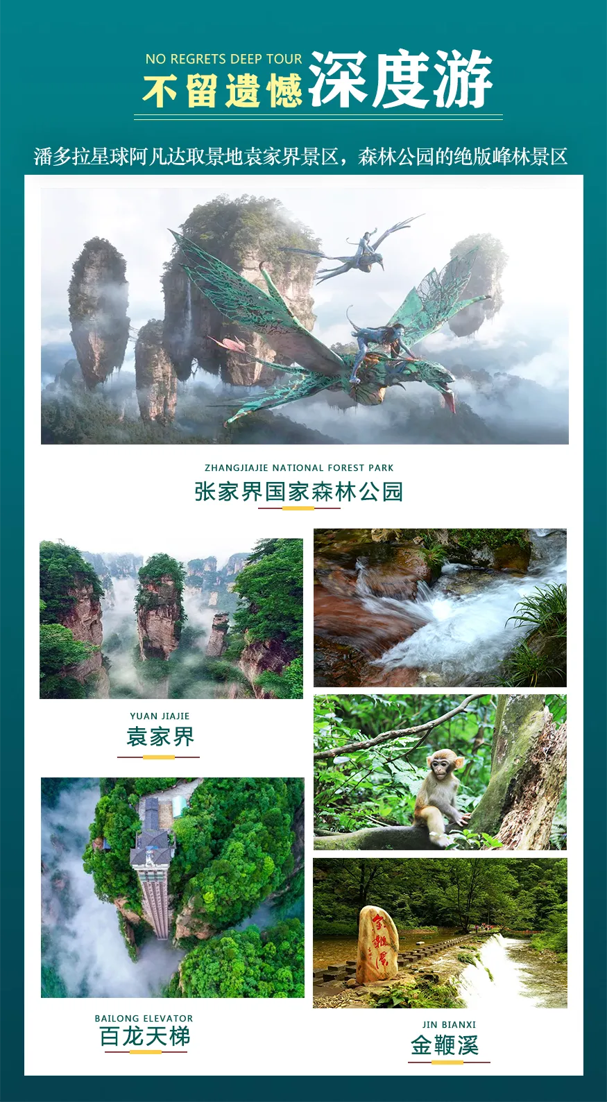 后赠送乘坐百龙天梯下山,漫步世界最美的【金鞭溪风景区精华段】:杉林幽静,穿行在峰峦幽谷云间,溪水明净,人沿清 溪行,胜似画中游,这是一条观赏性与自娱性结合的旅游线路,十里长溪,山回路转,一步一景,十步 一重天,小溪潺潺的流经你的脚下,似琵琶,似古筝,时而丁冬悦耳,时而涓涓小吟; 稍后乘环保车出景区。